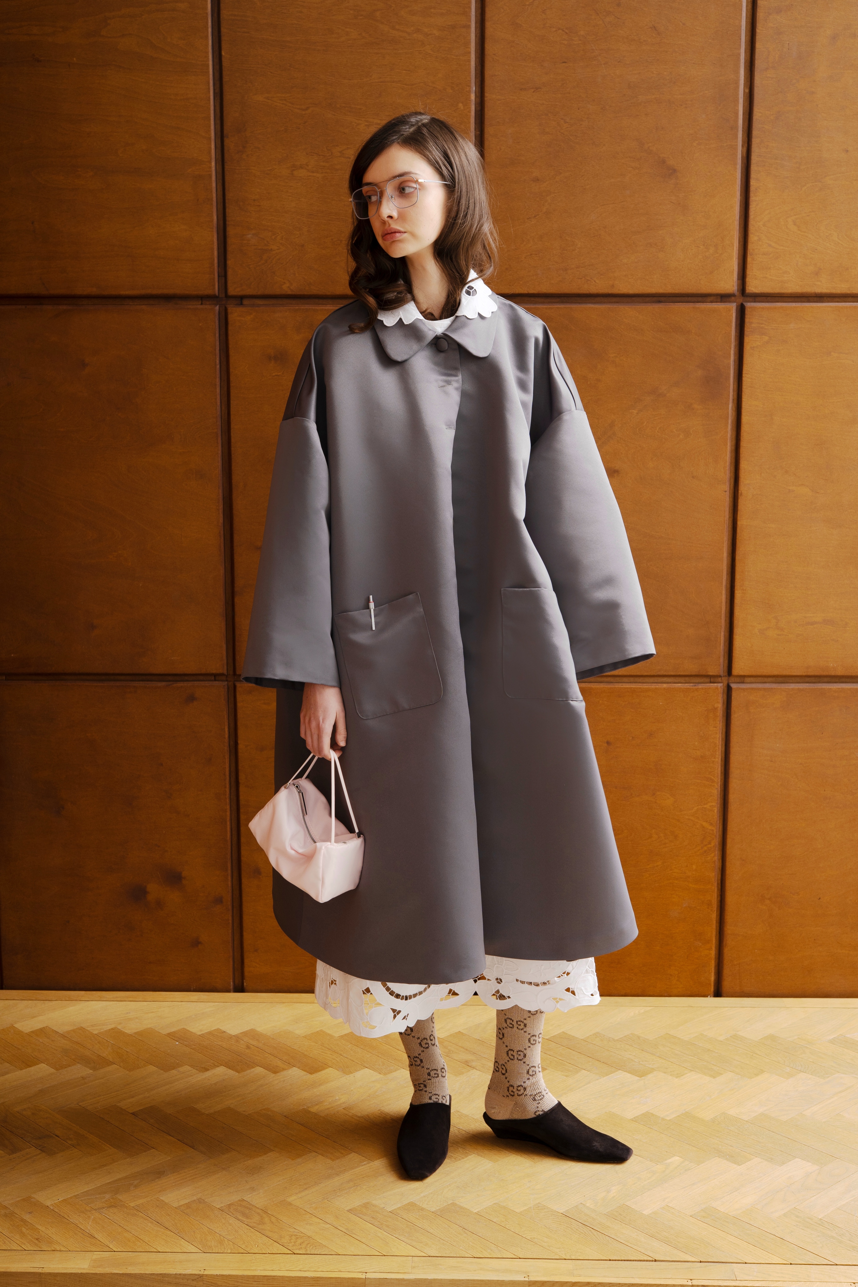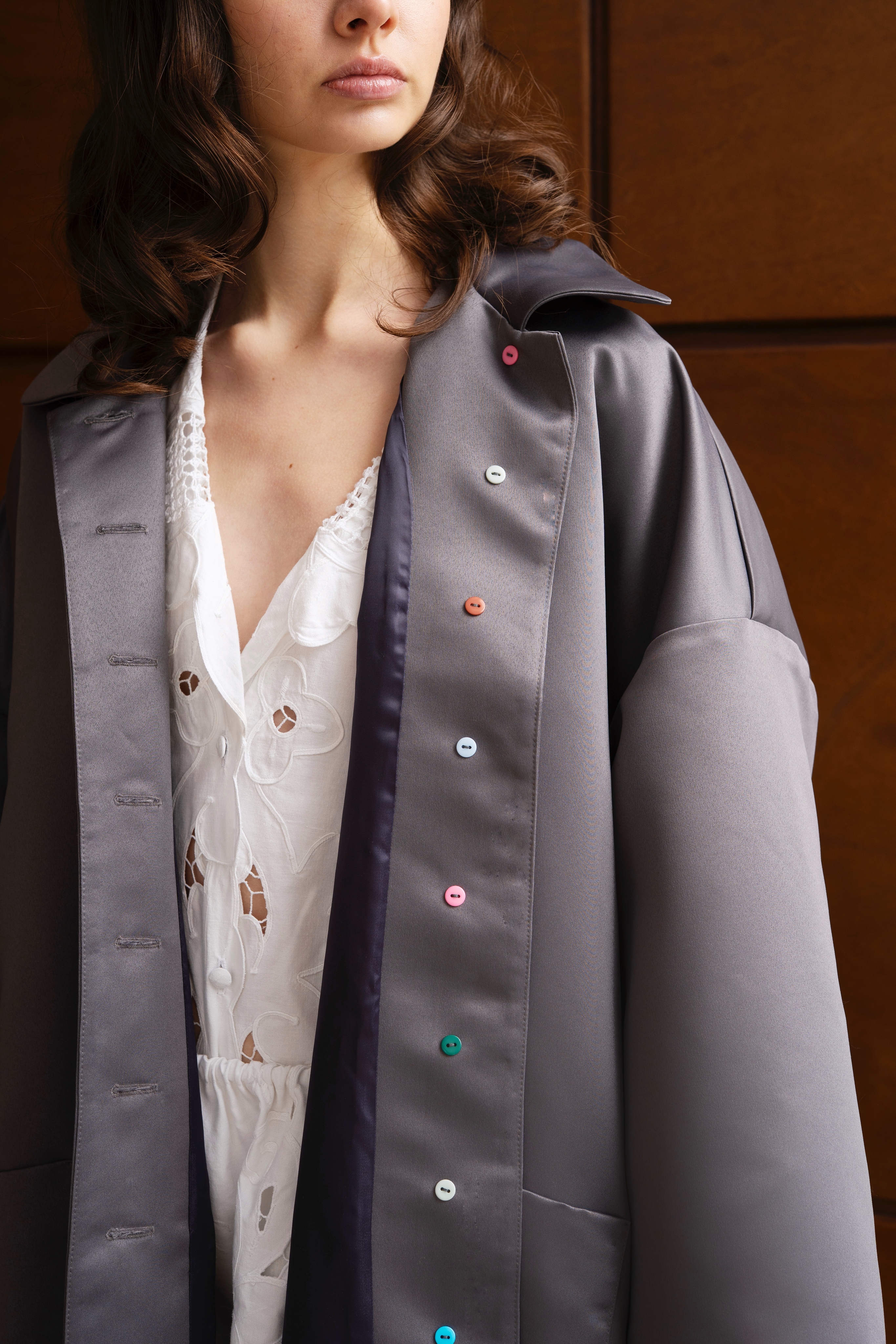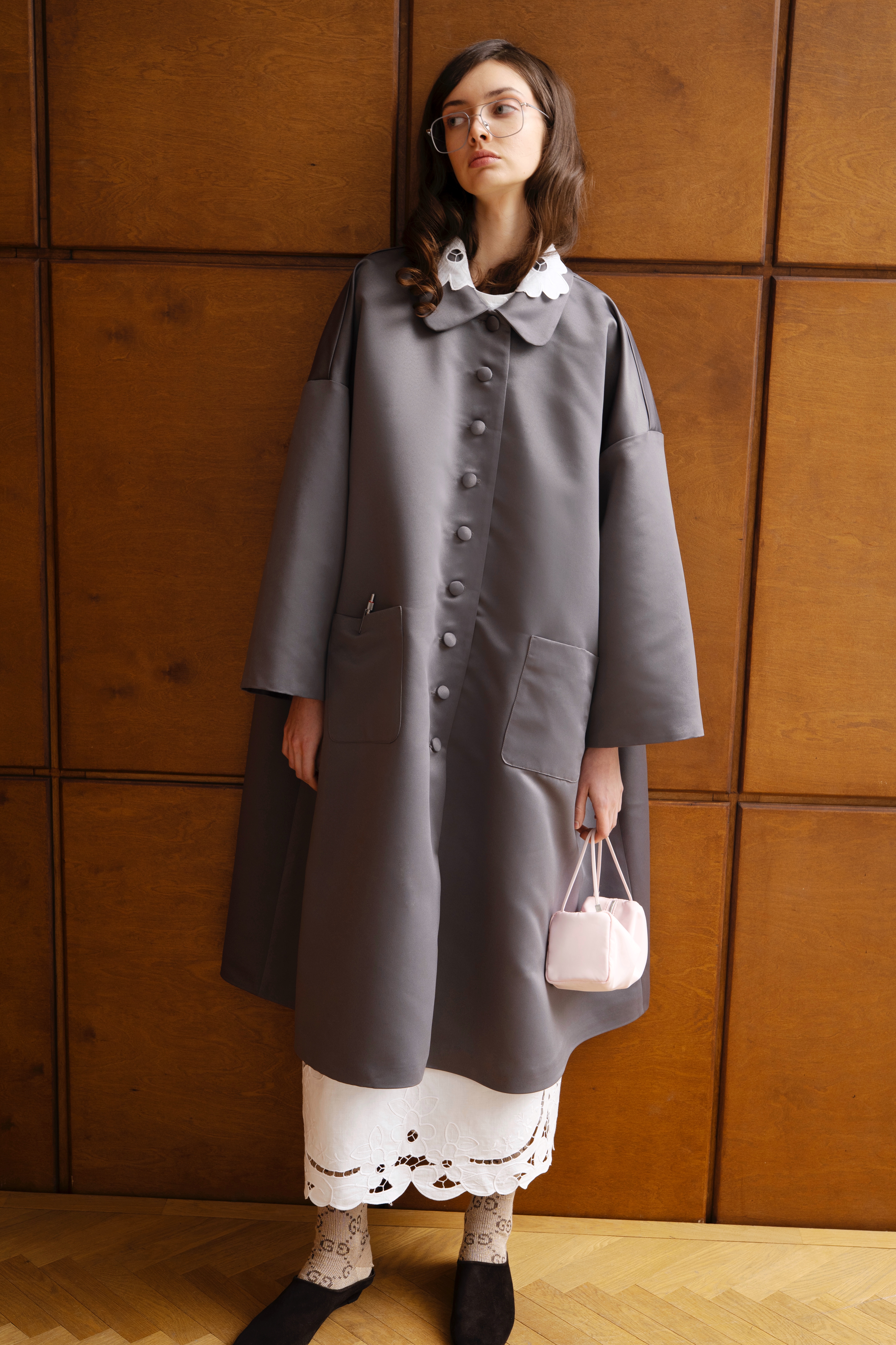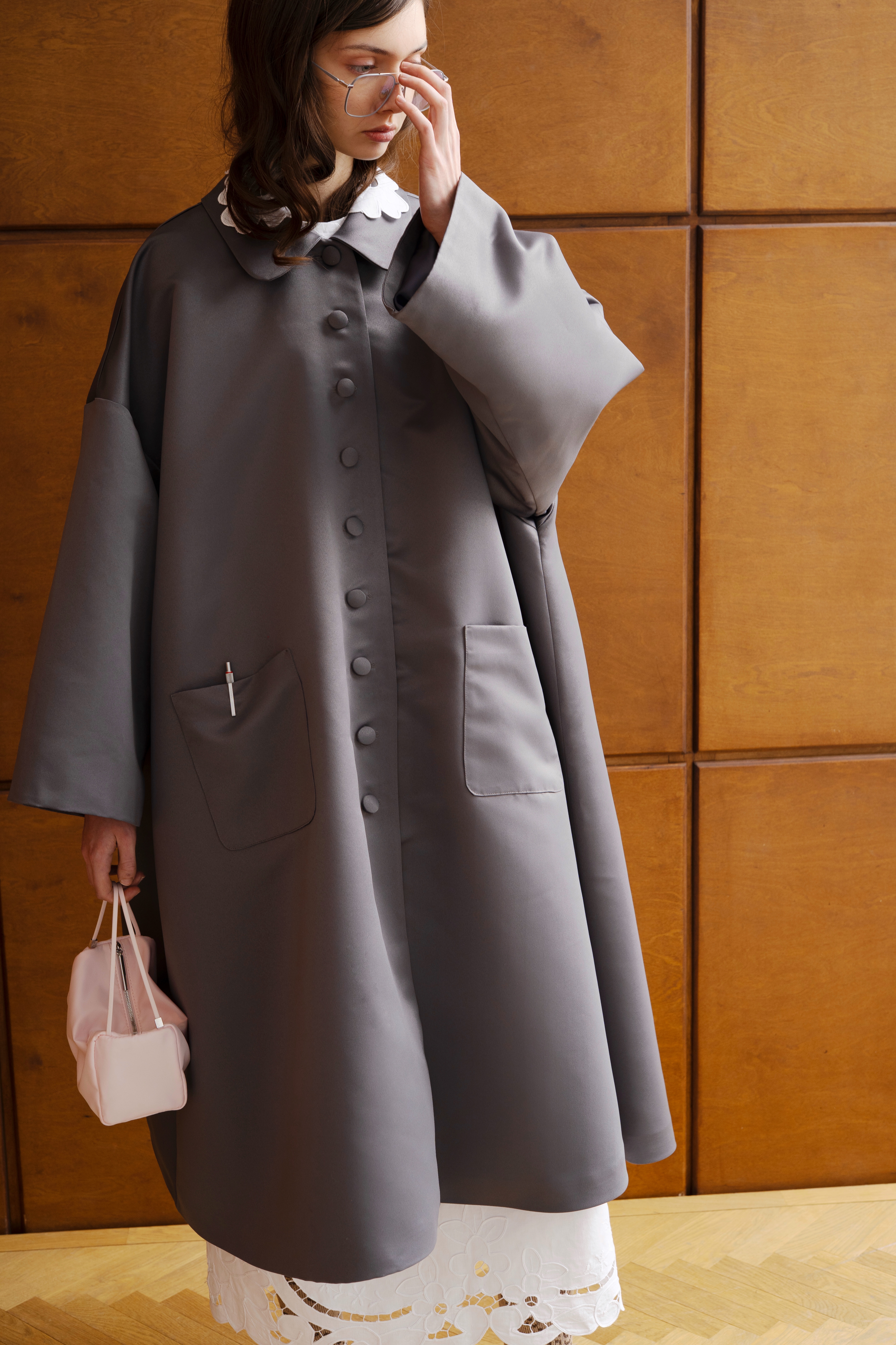 • Плащ свободного расширенного силуэта в жемчужном сером цвете с шёлковой вышивкой на заднем кармашке.
