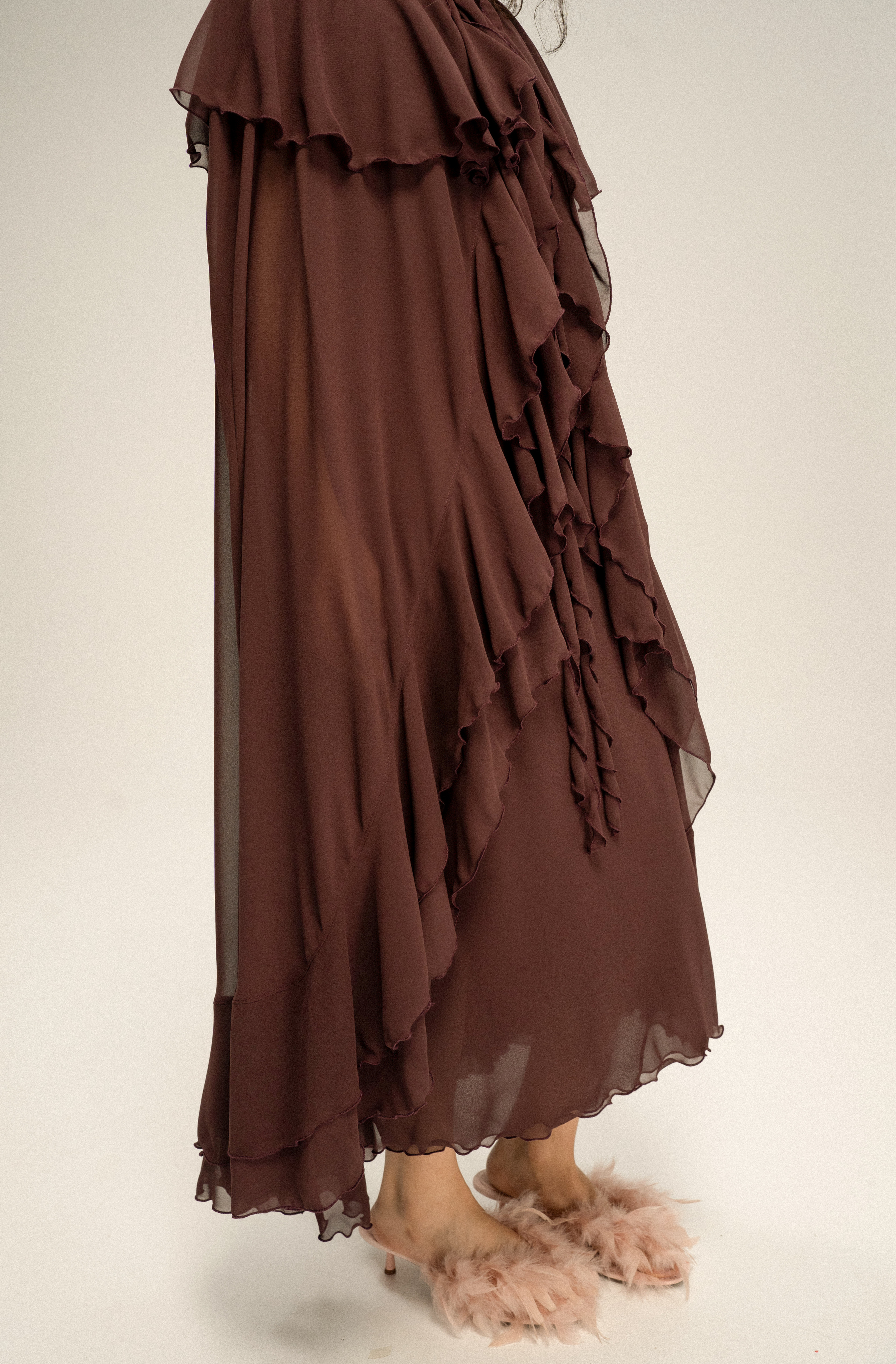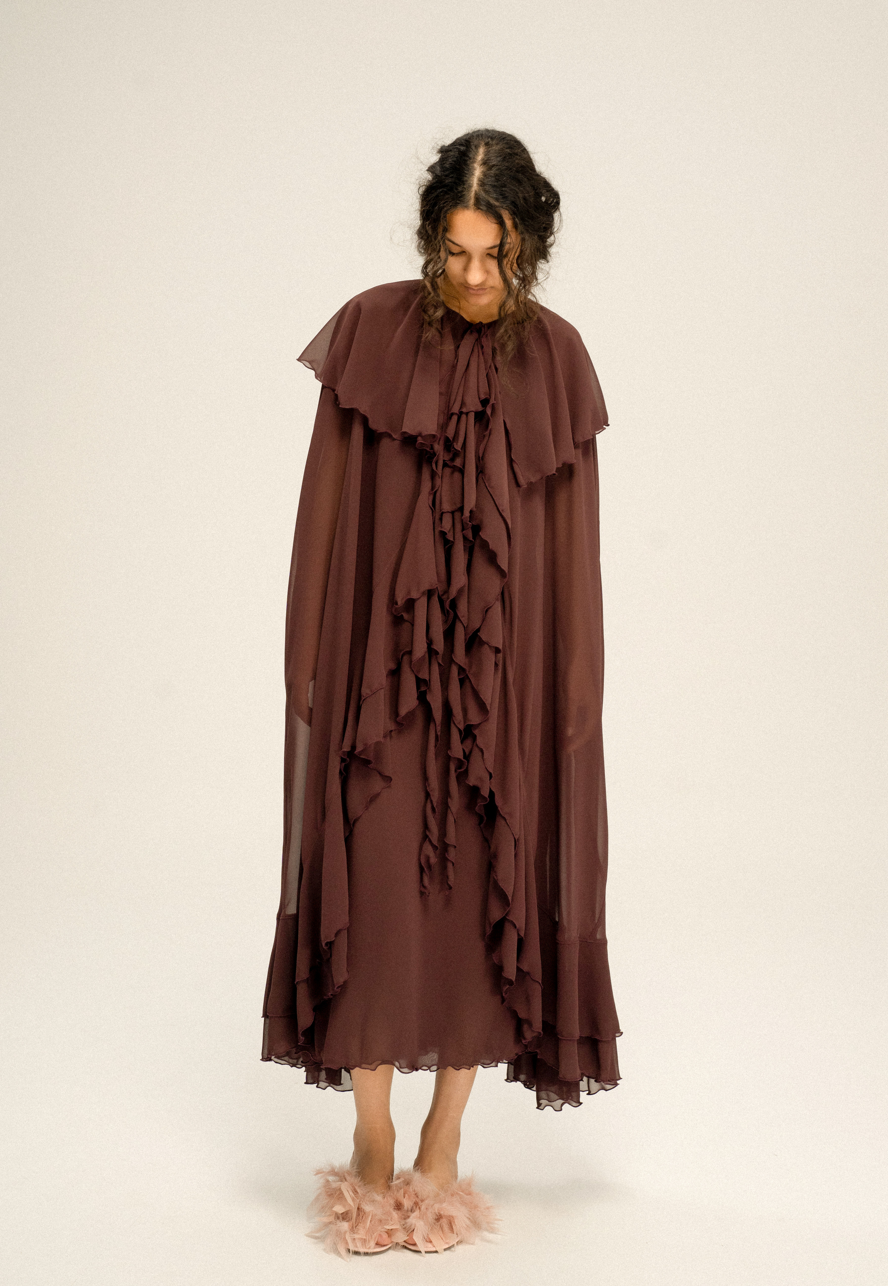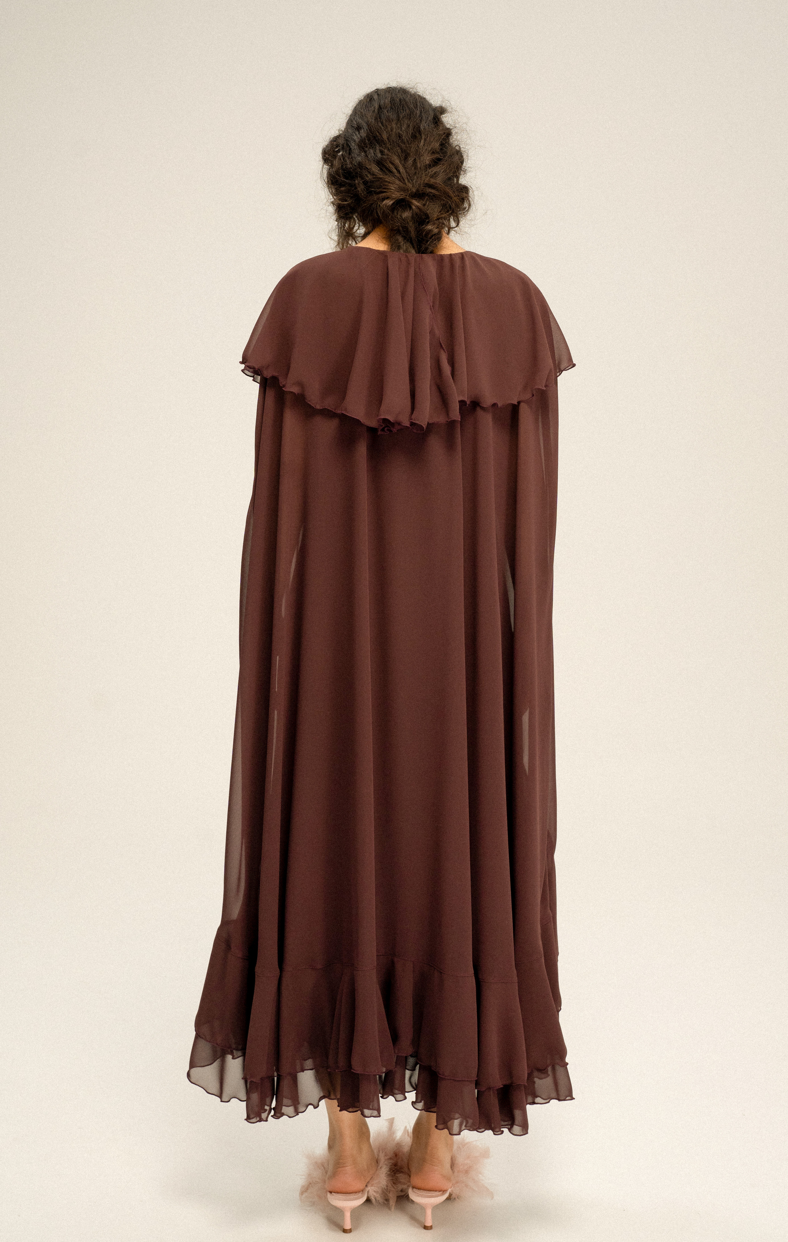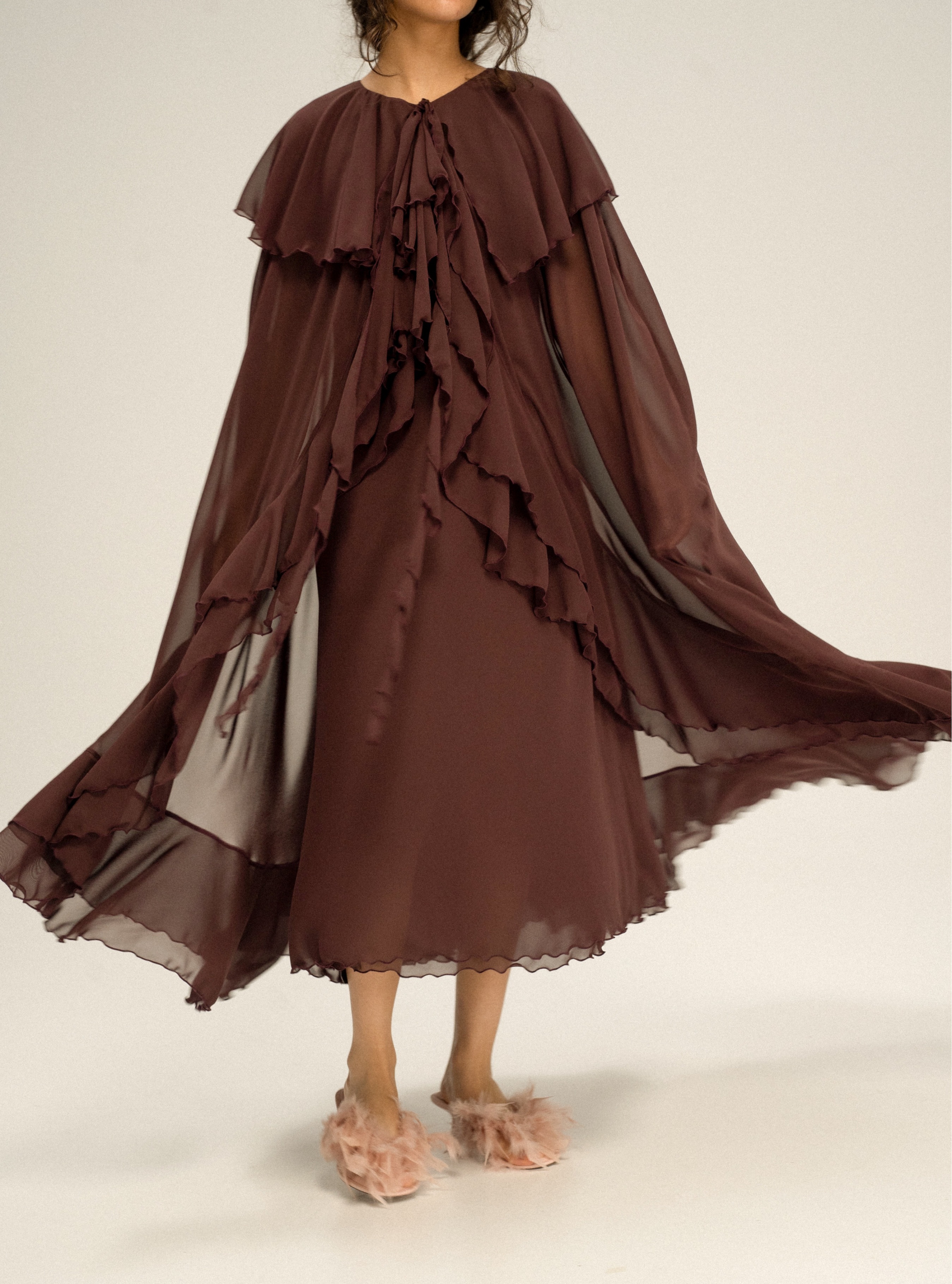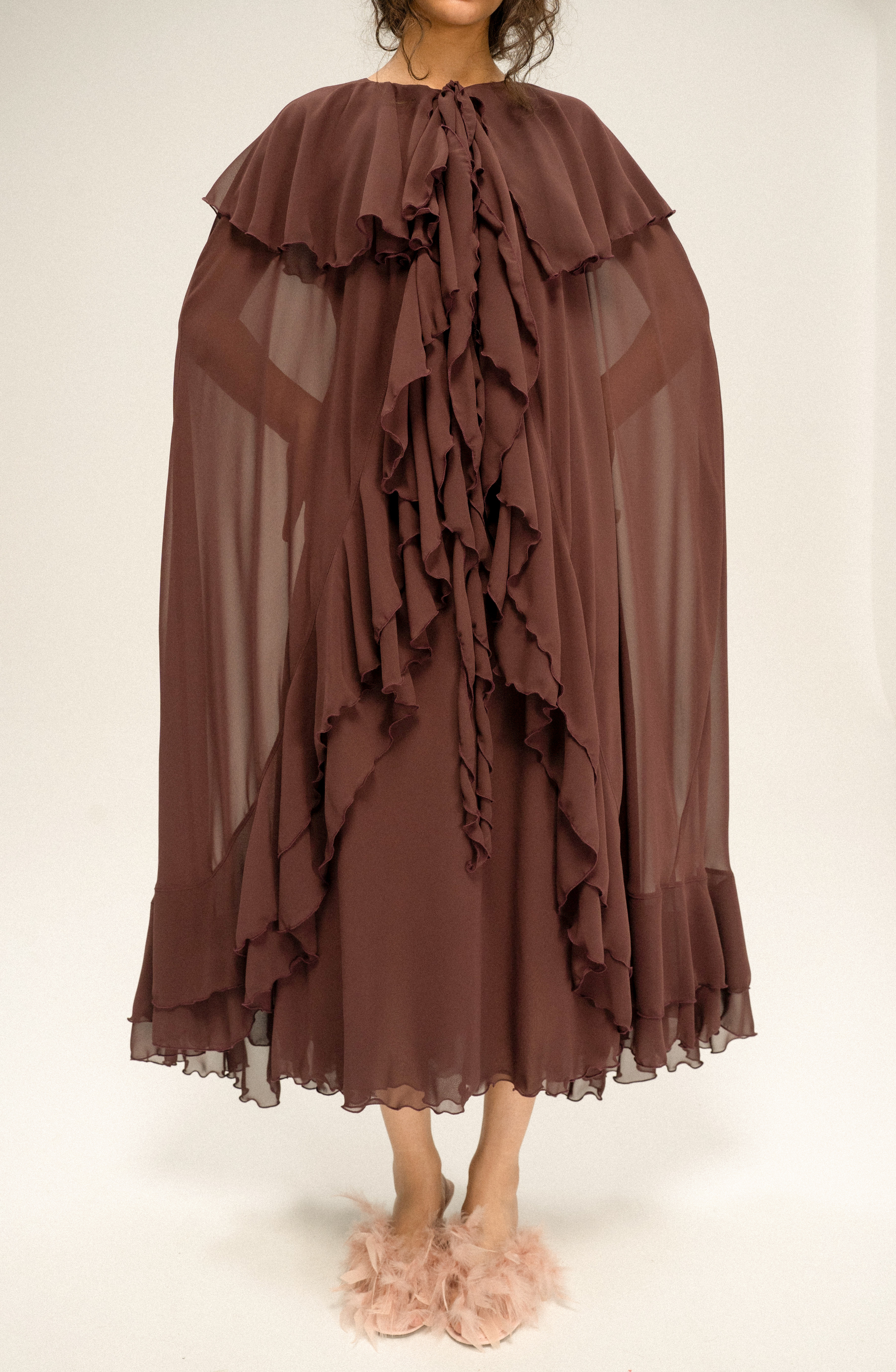 - Классическая комбинация из двух слоев ткани дополненная кейпом с густыми рюшами в кофейном цвете с оттенком сливы.