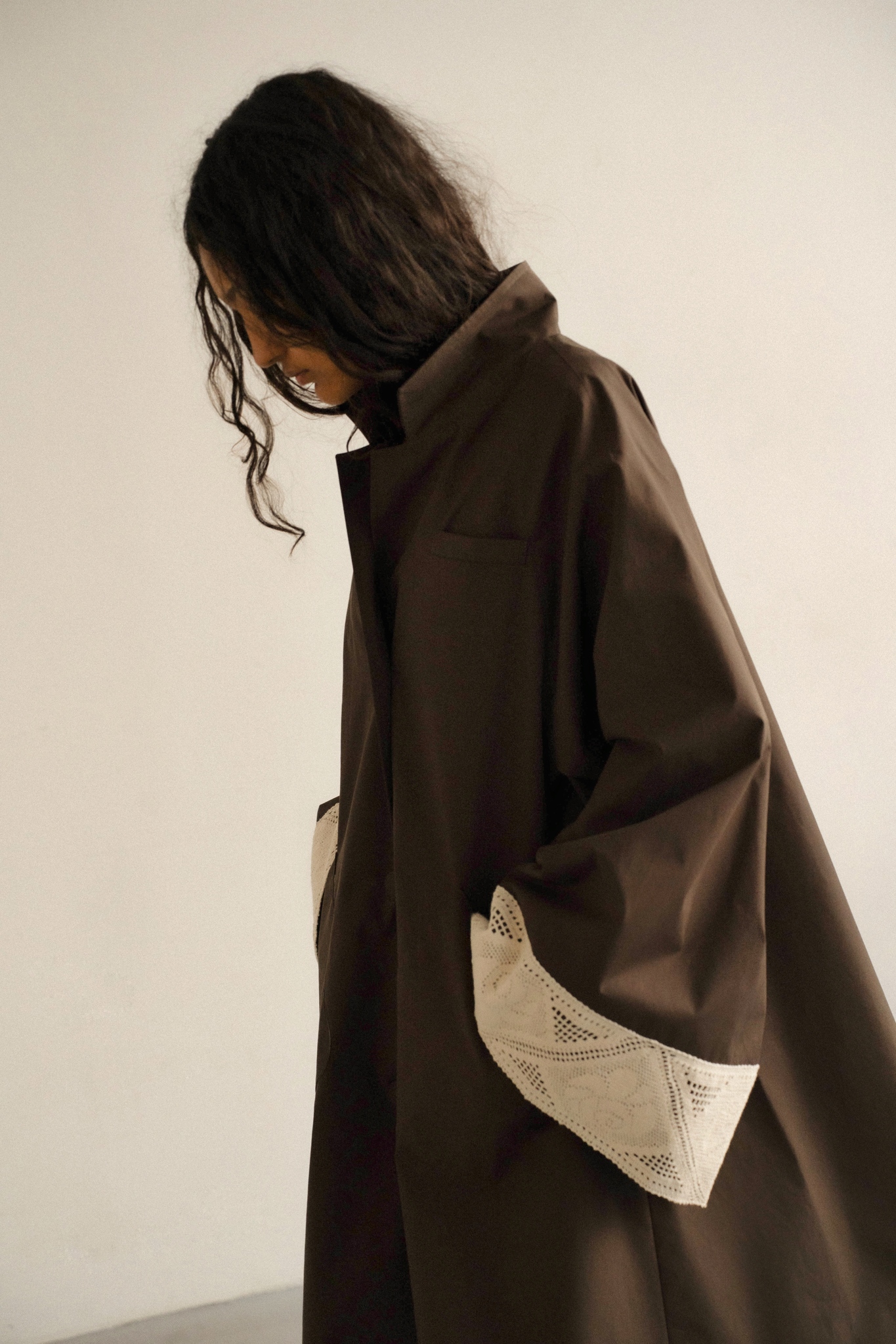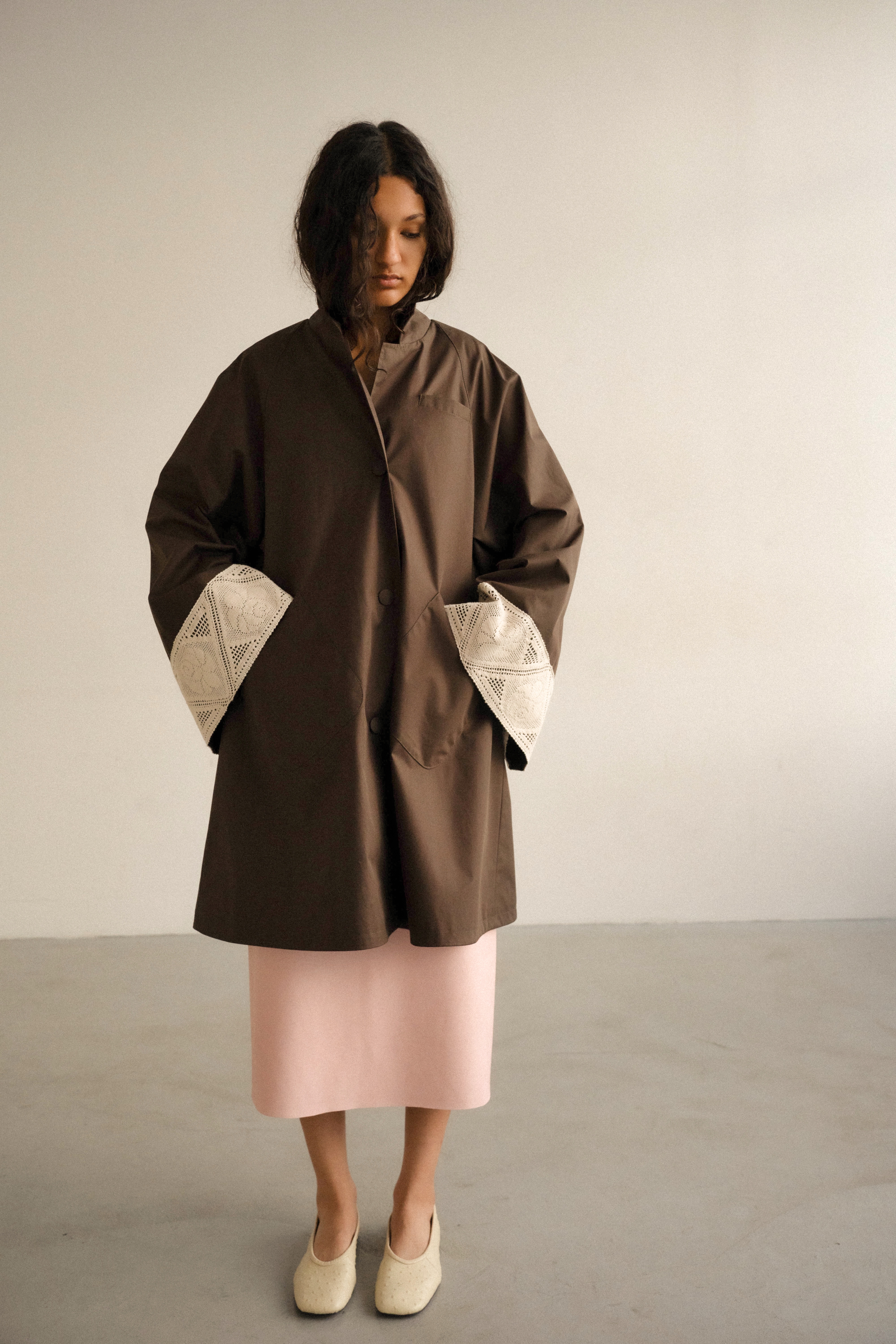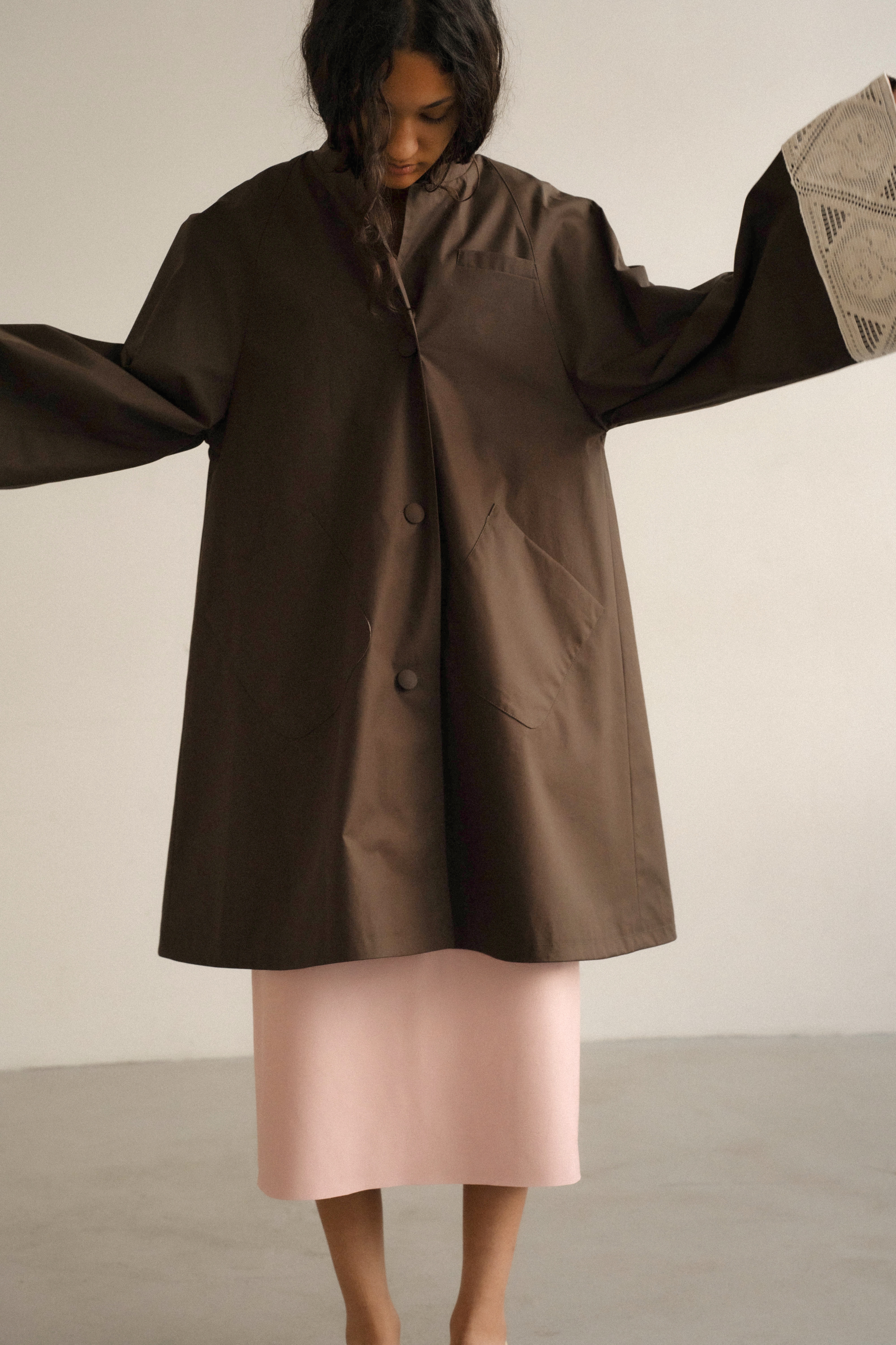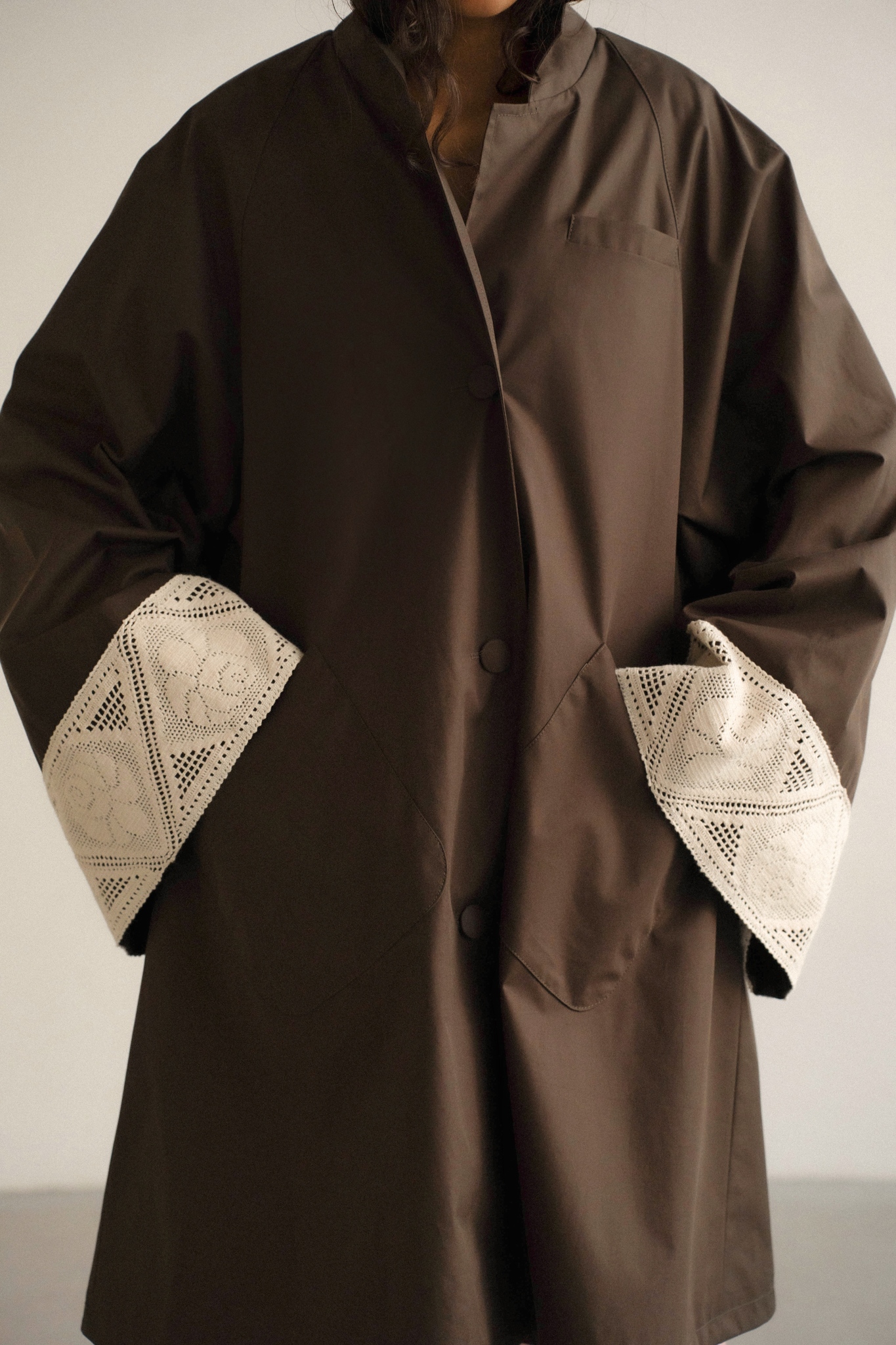 - Плащ в сложном оливково-кофейном оттенке свободного силуэта.