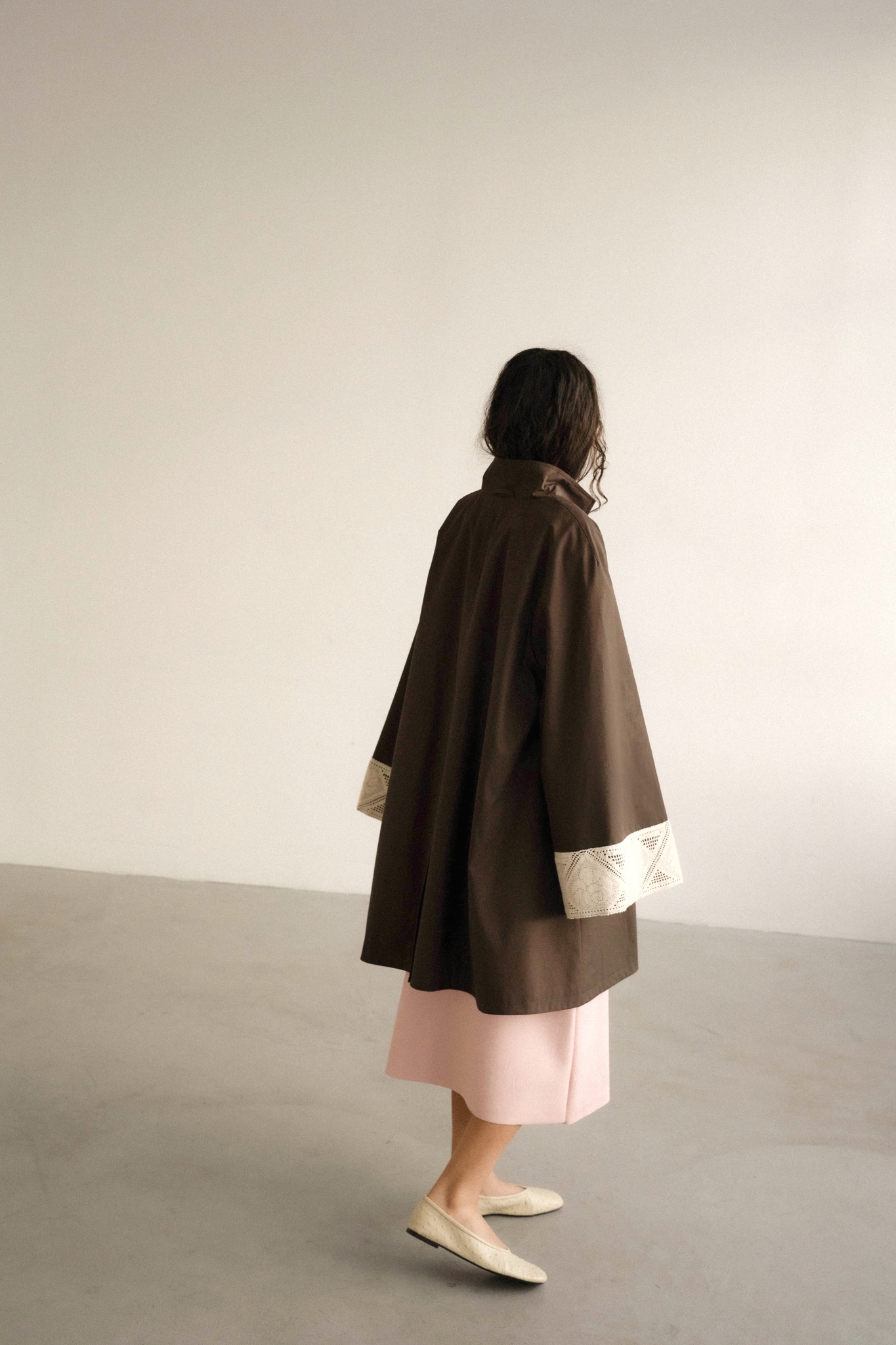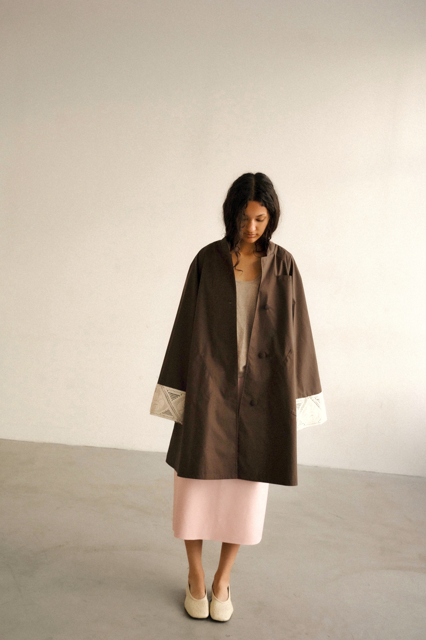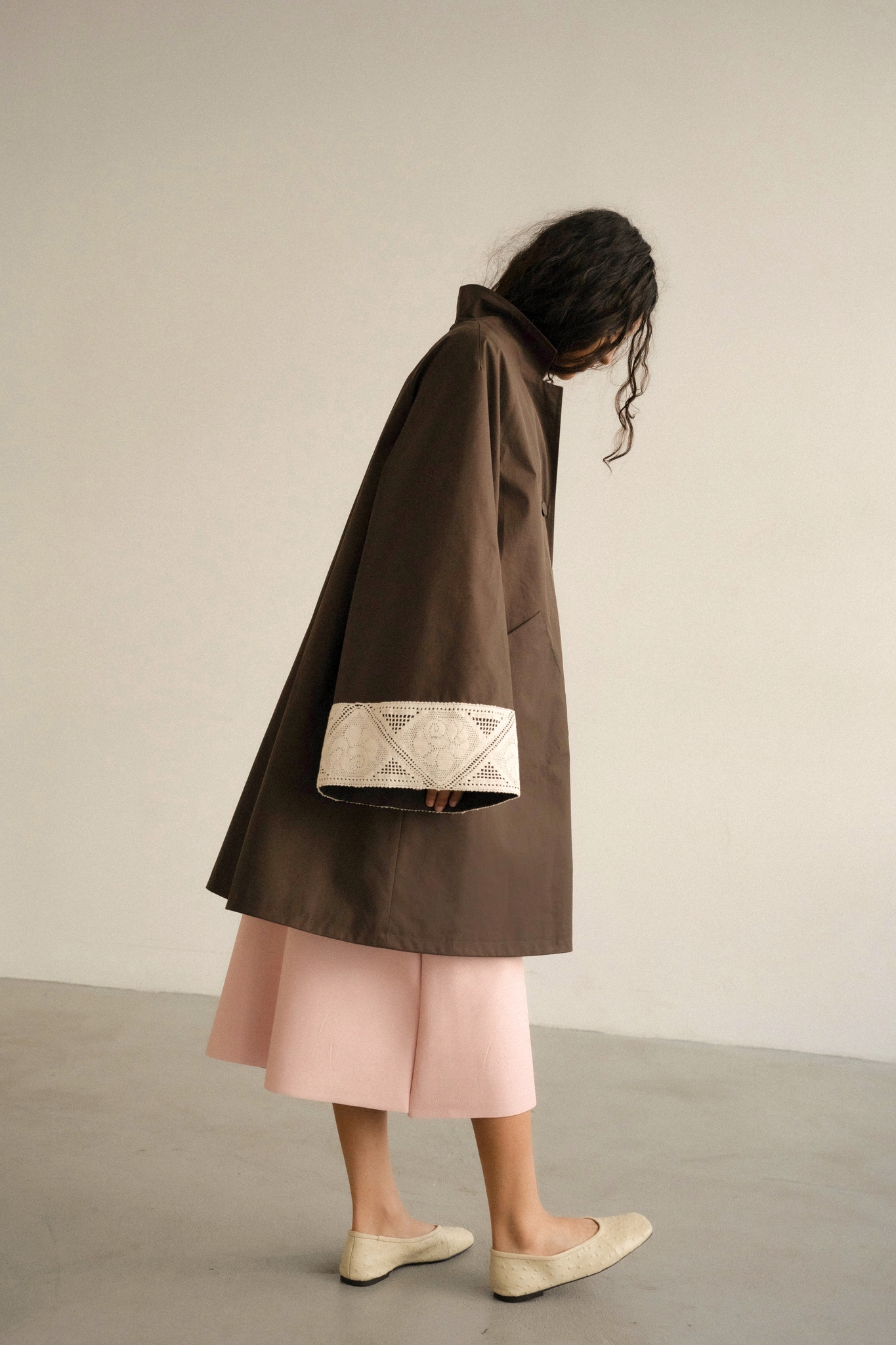- Плащ в сложном оливково-кофейном оттенке свободного силуэта.