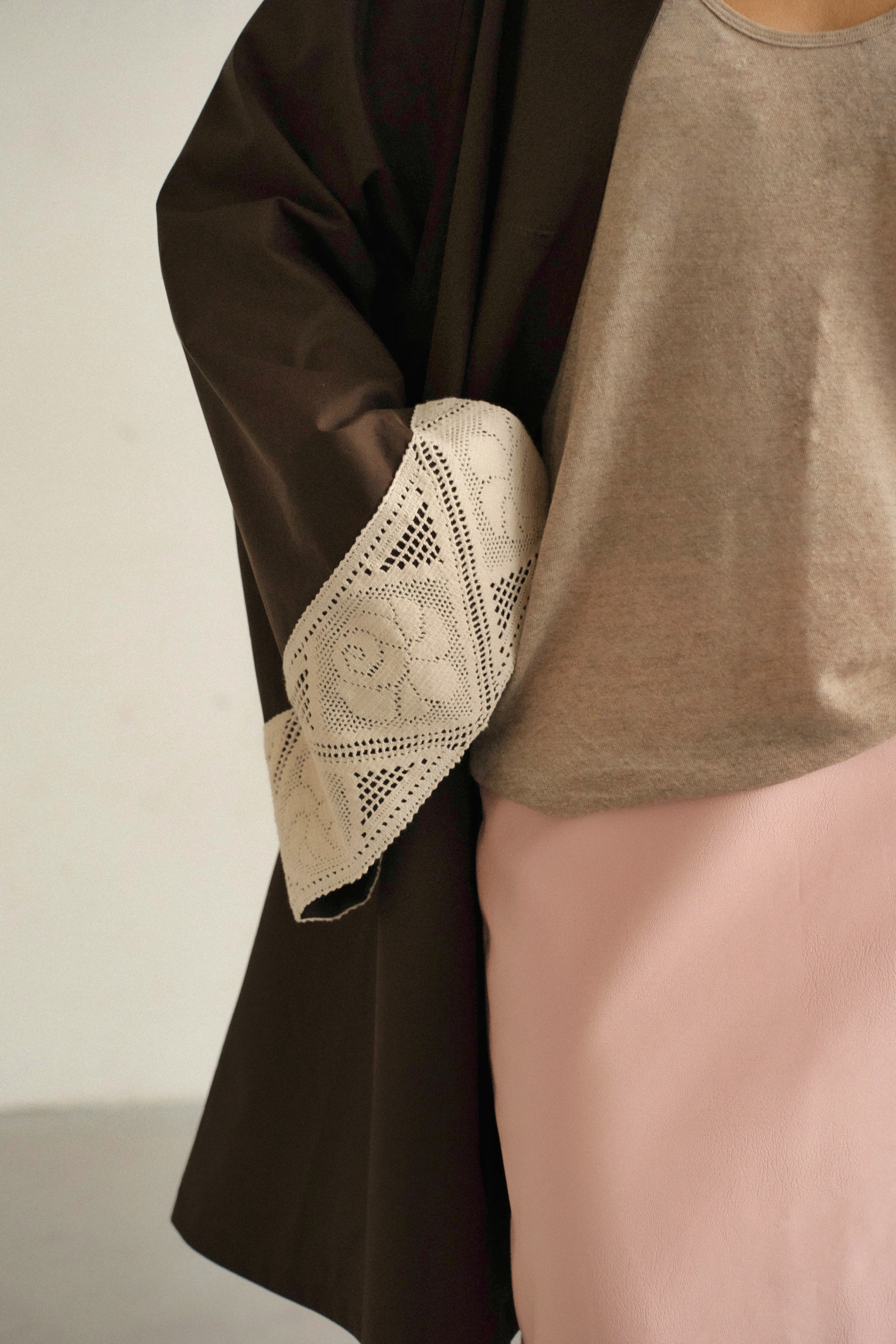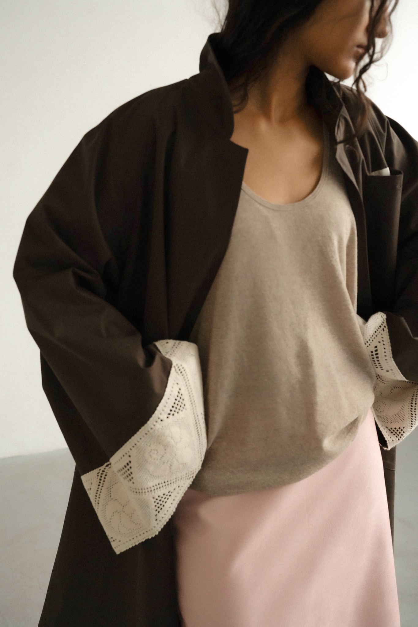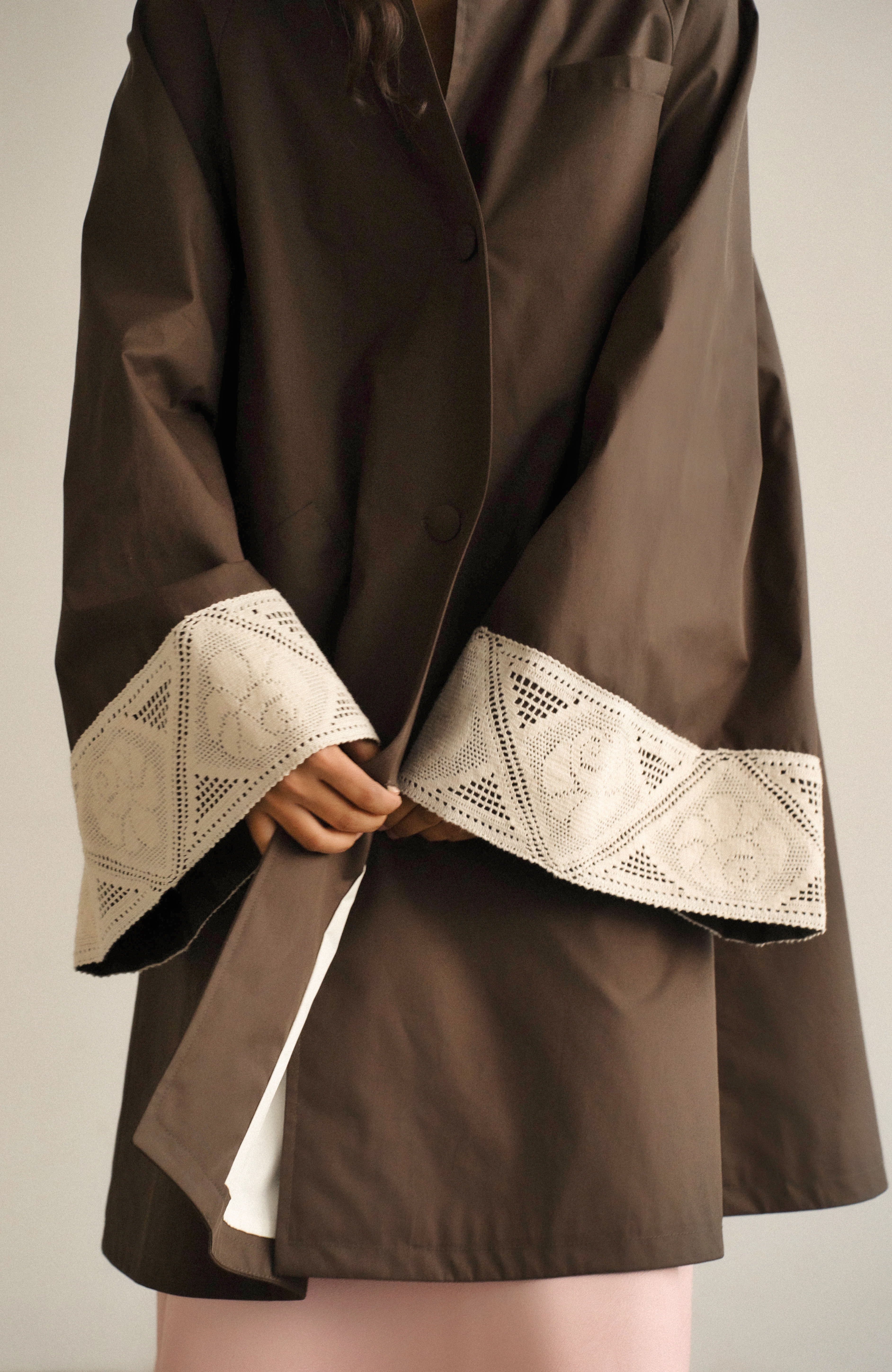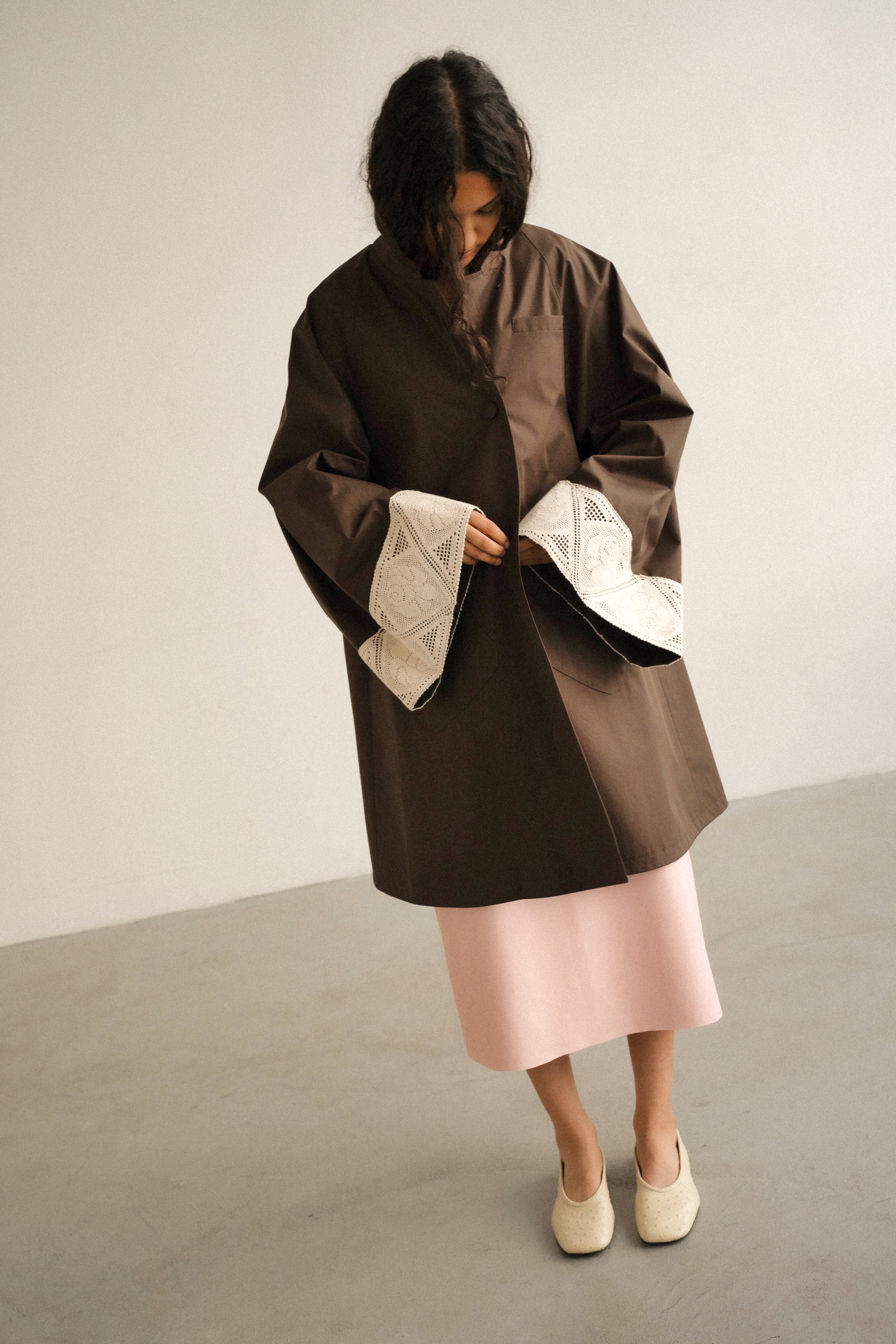 - Плащ в сложном оливково-кофейном оттенке свободного силуэта.