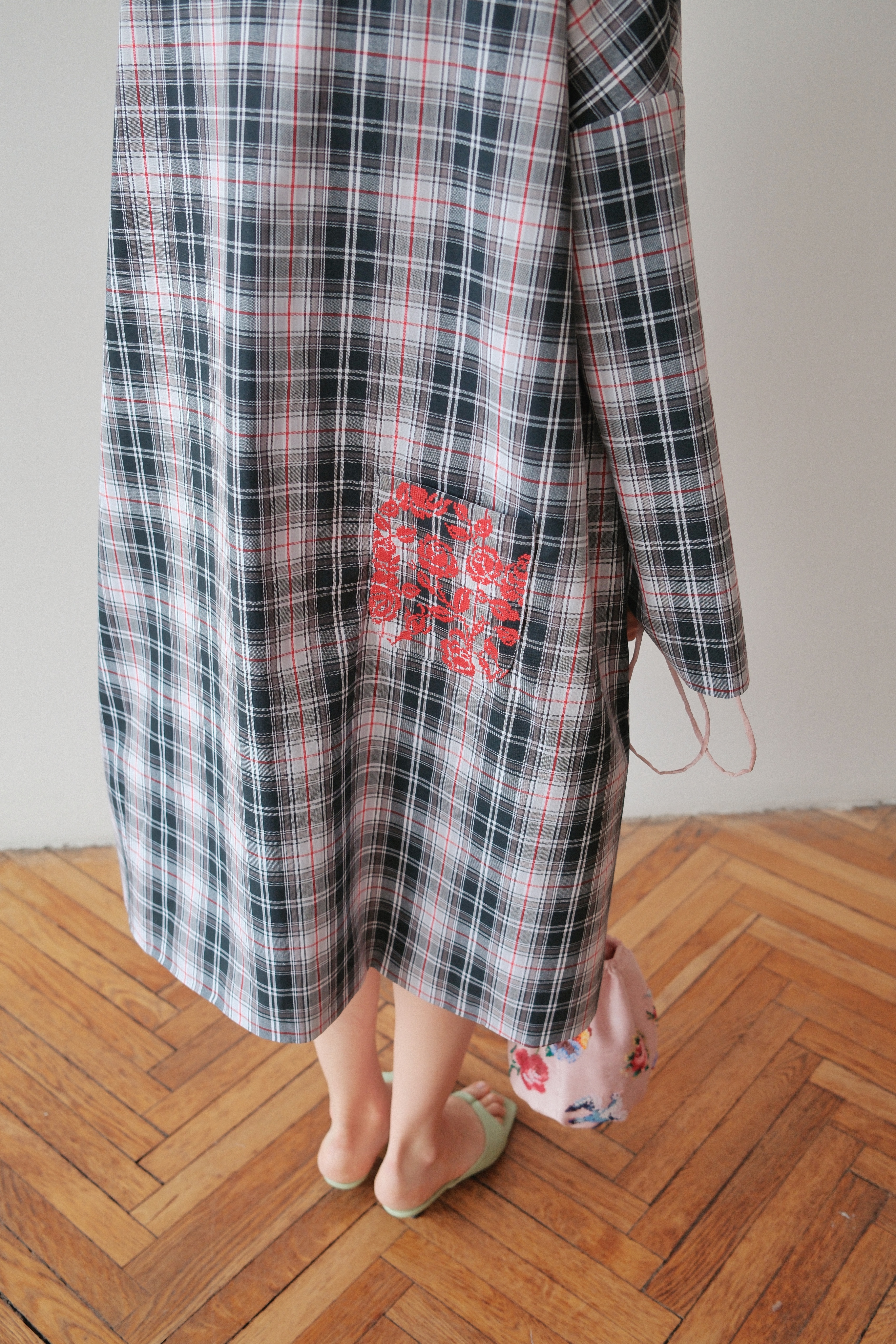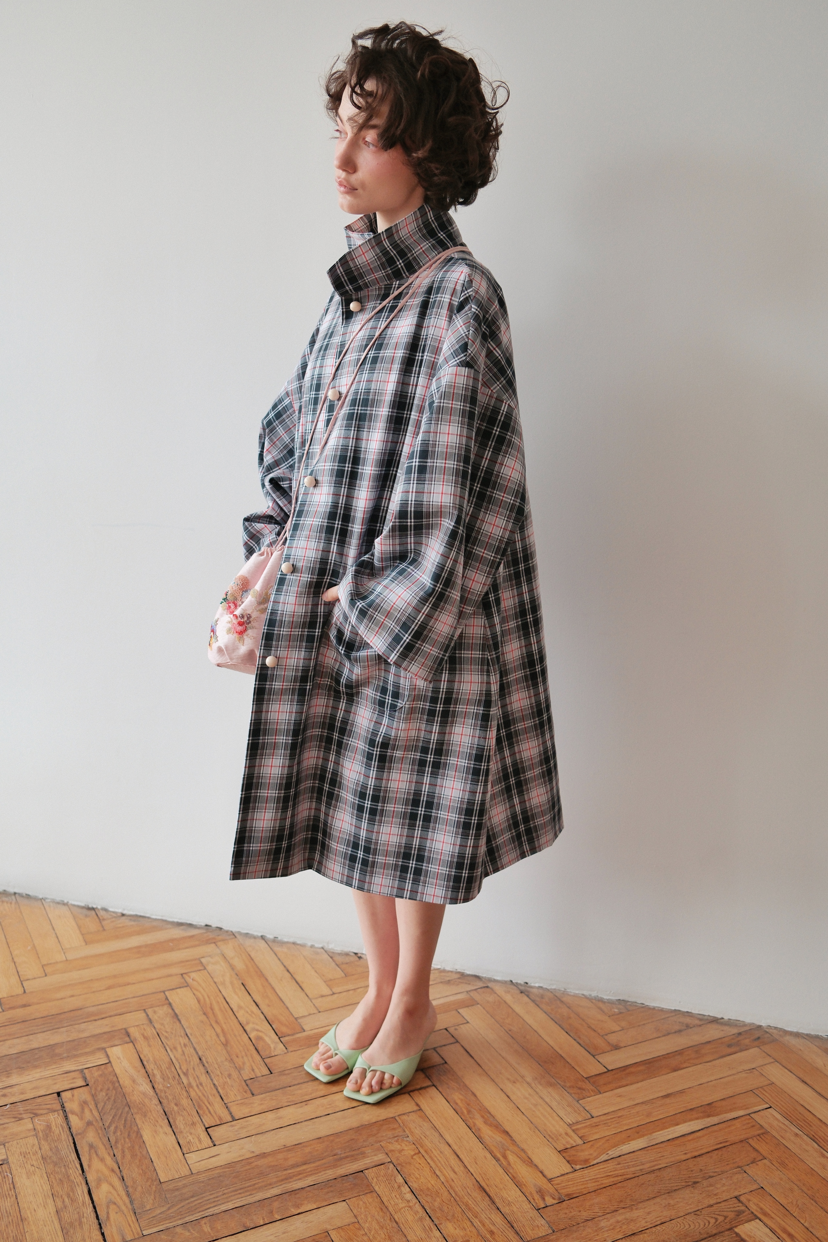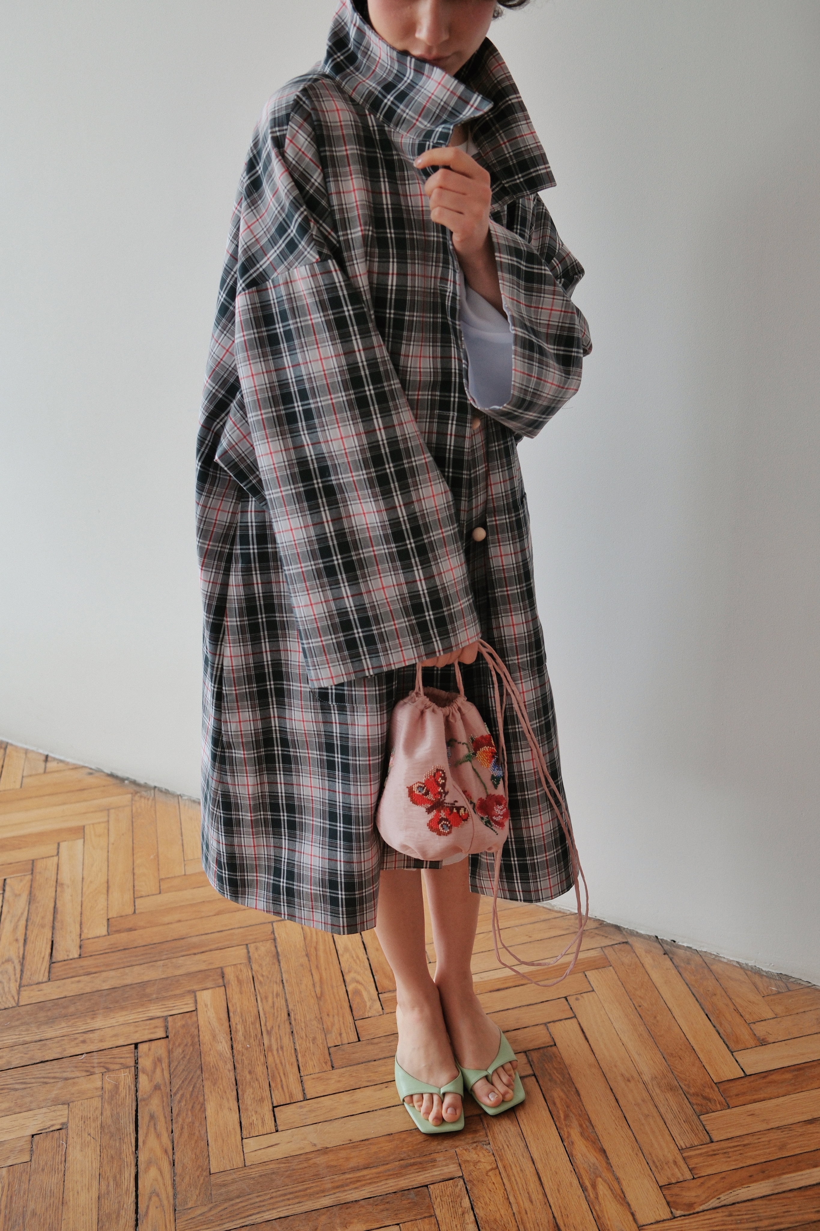 Плащ свободного кроя с воротником стойкой. На спинке расположился кармашек расшитый вручную алыми розочками.
