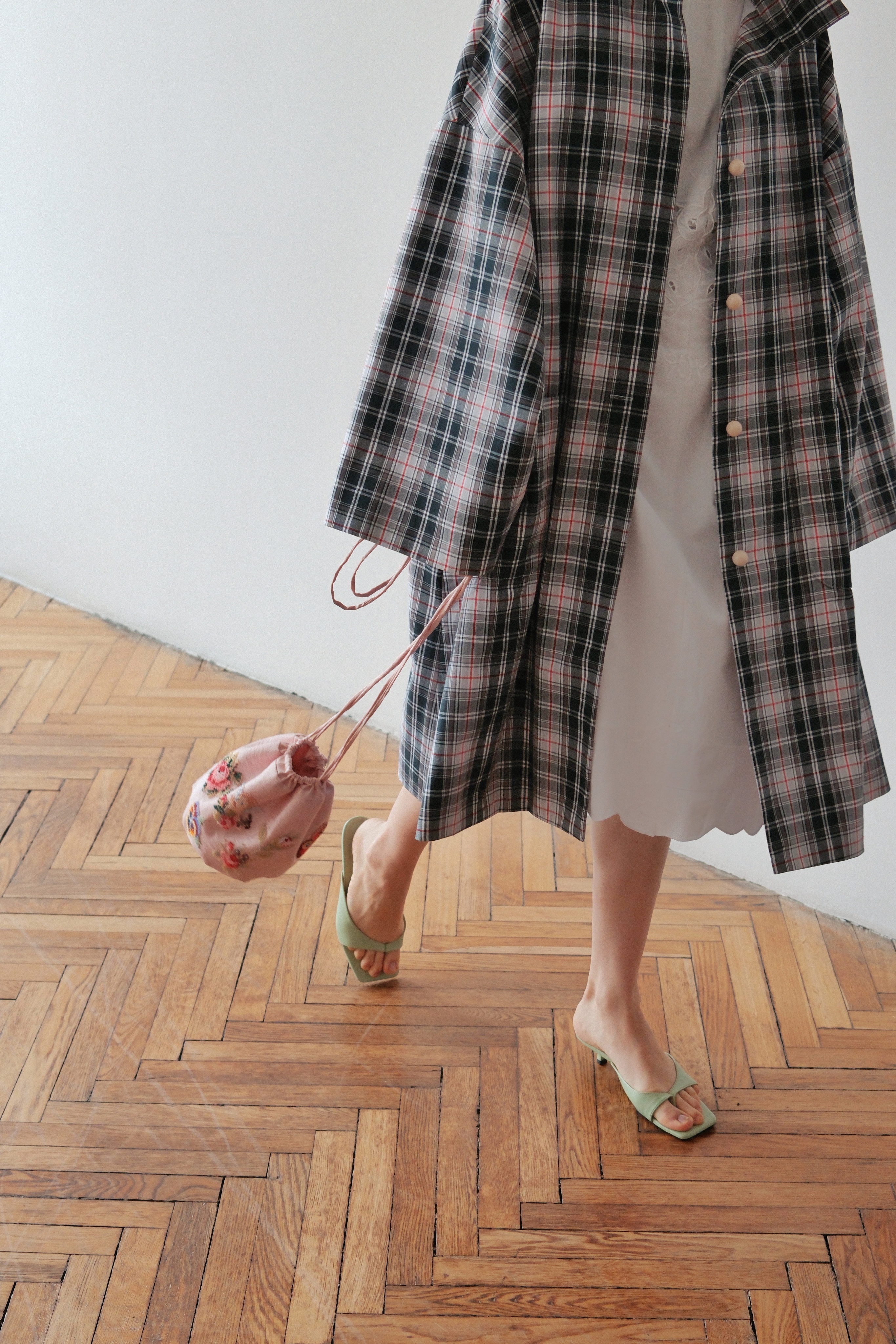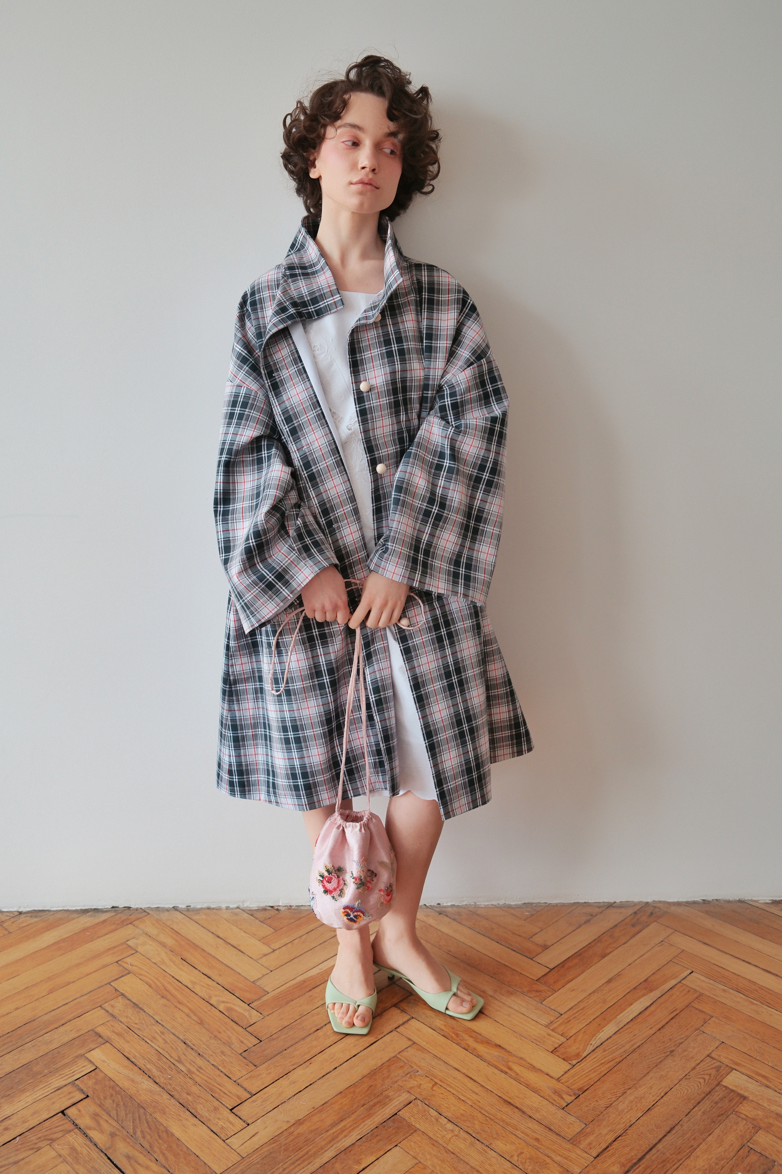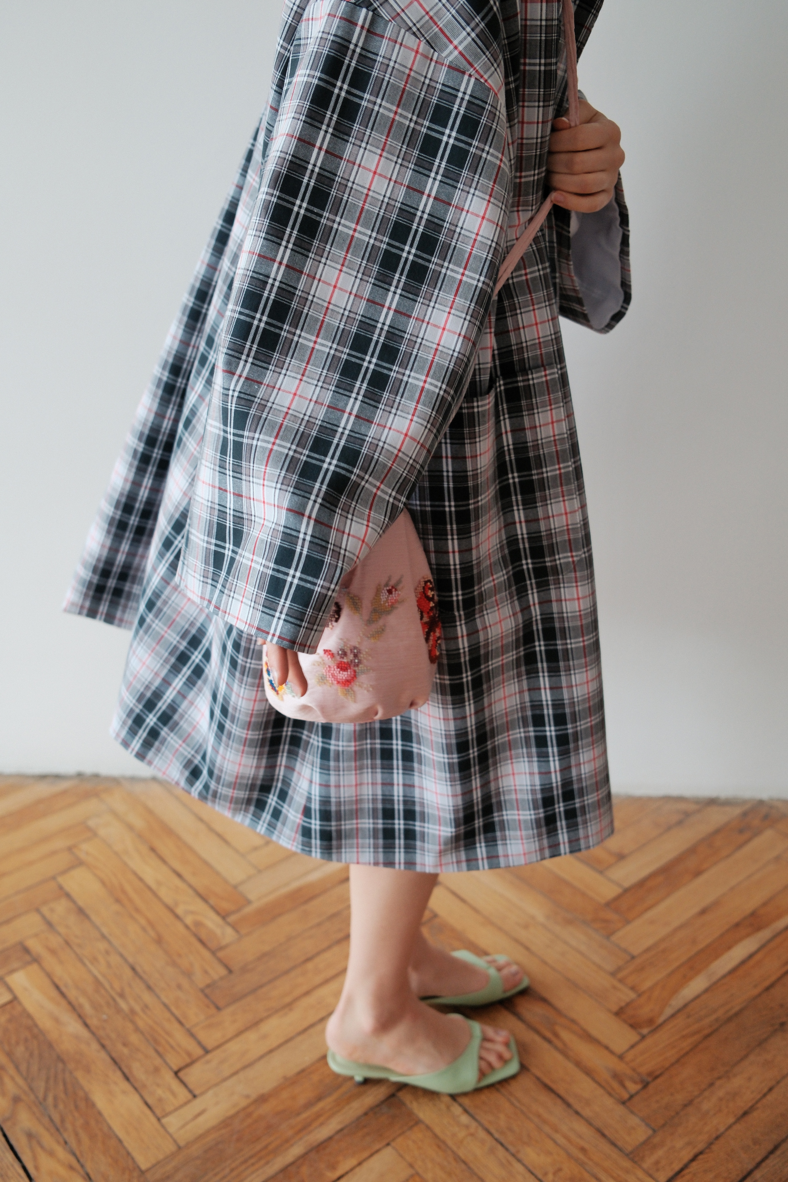 Плащ свободного кроя с воротником стойкой. На спинке расположился кармашек расшитый вручную алыми розочками.