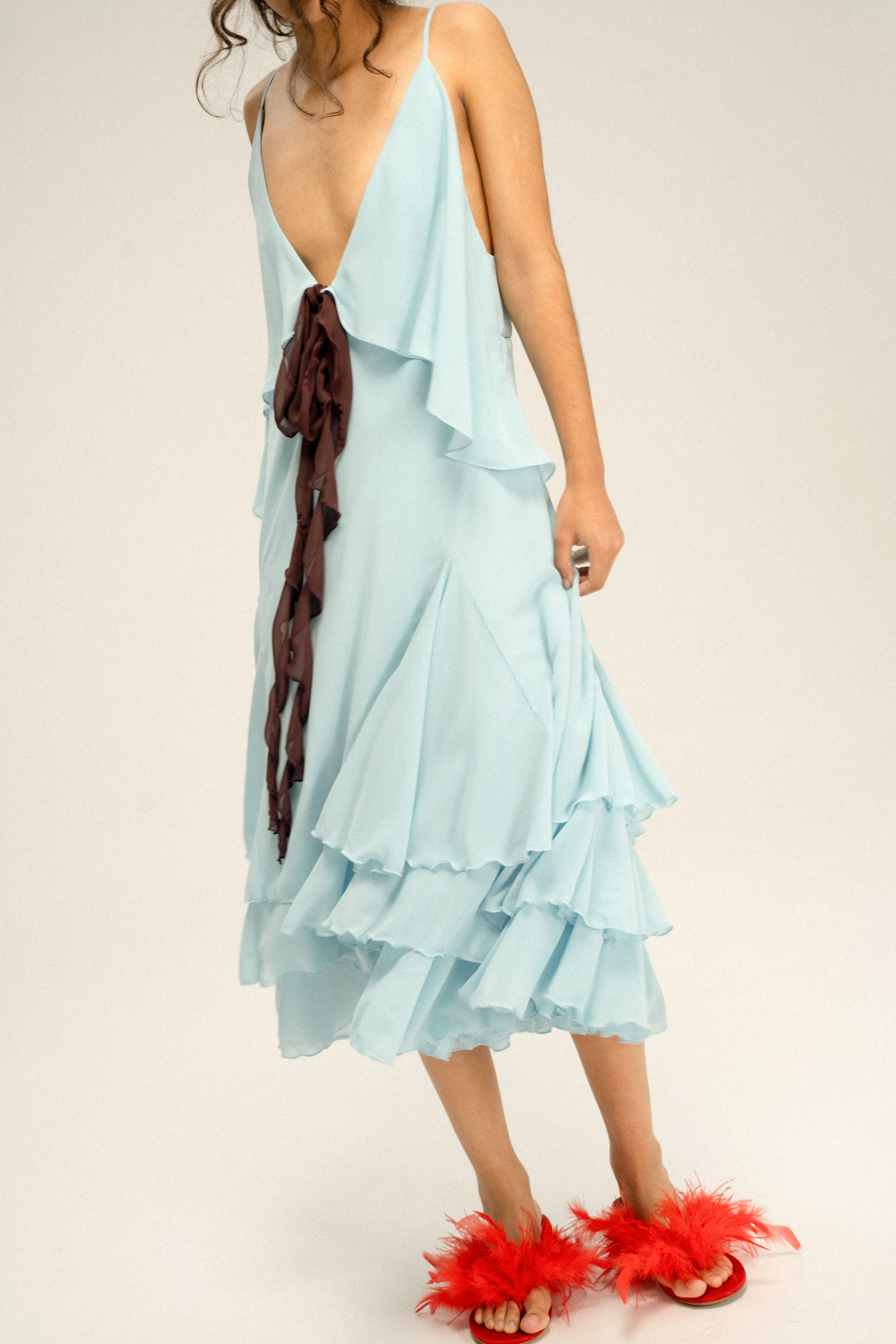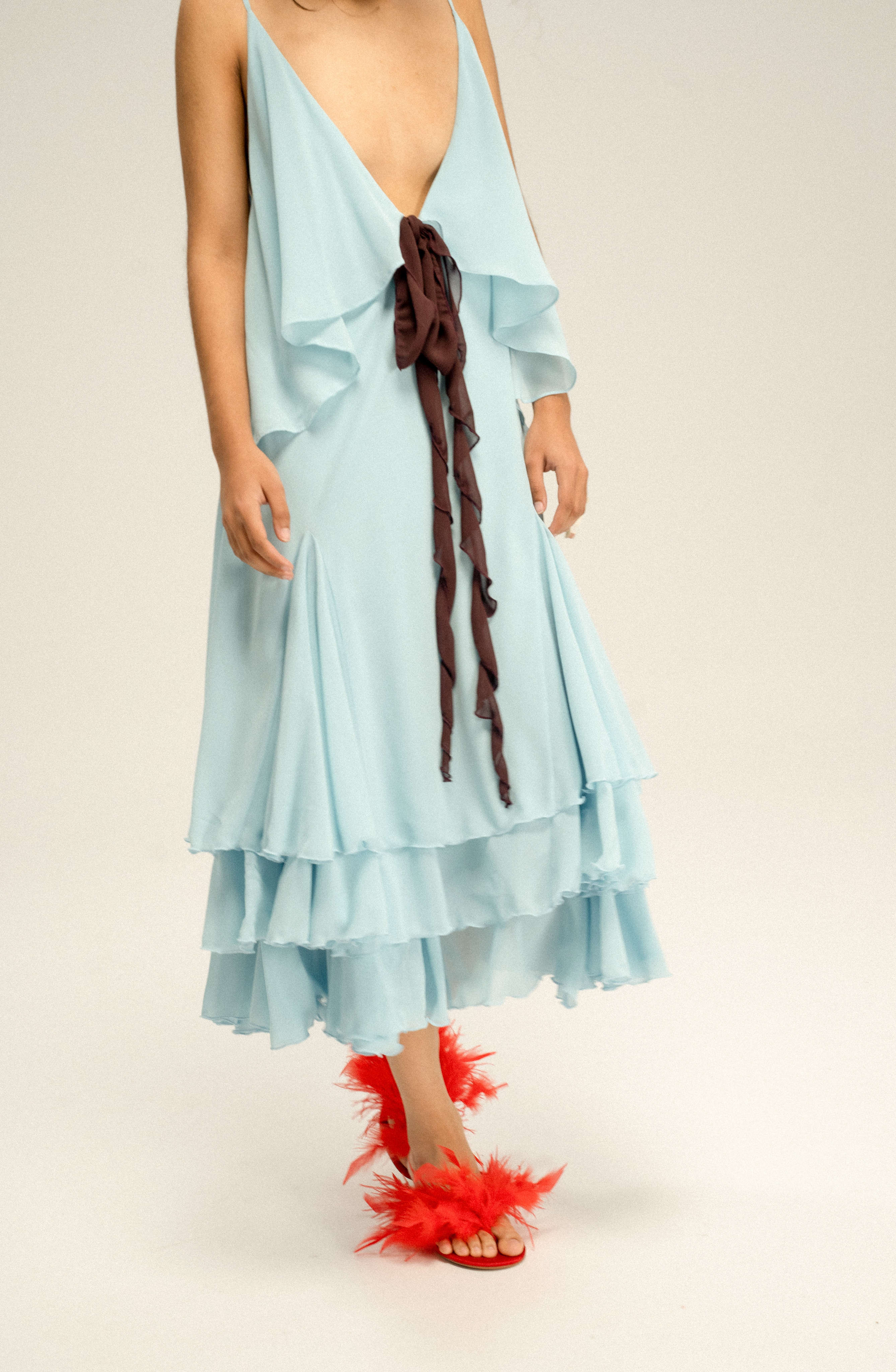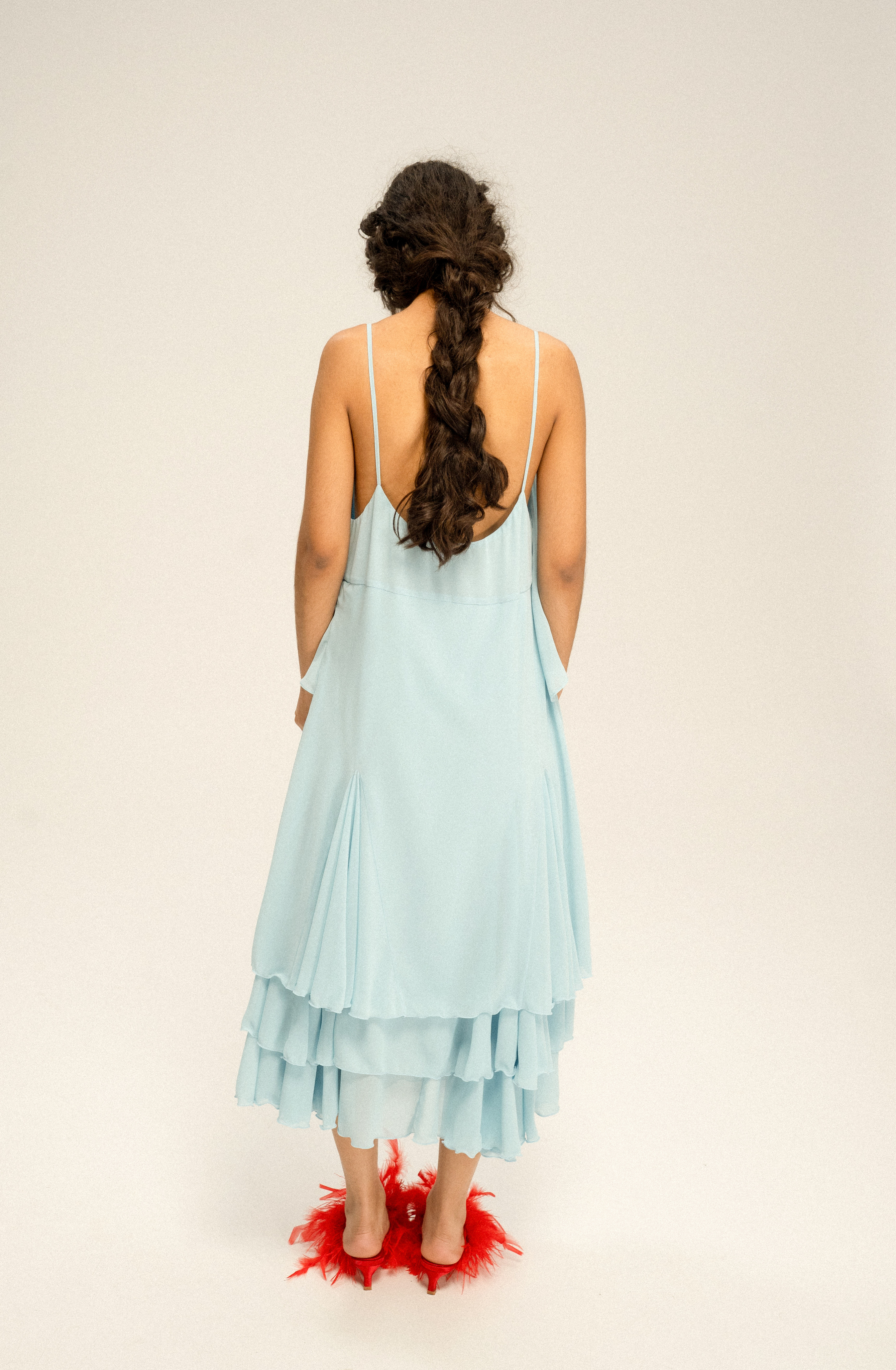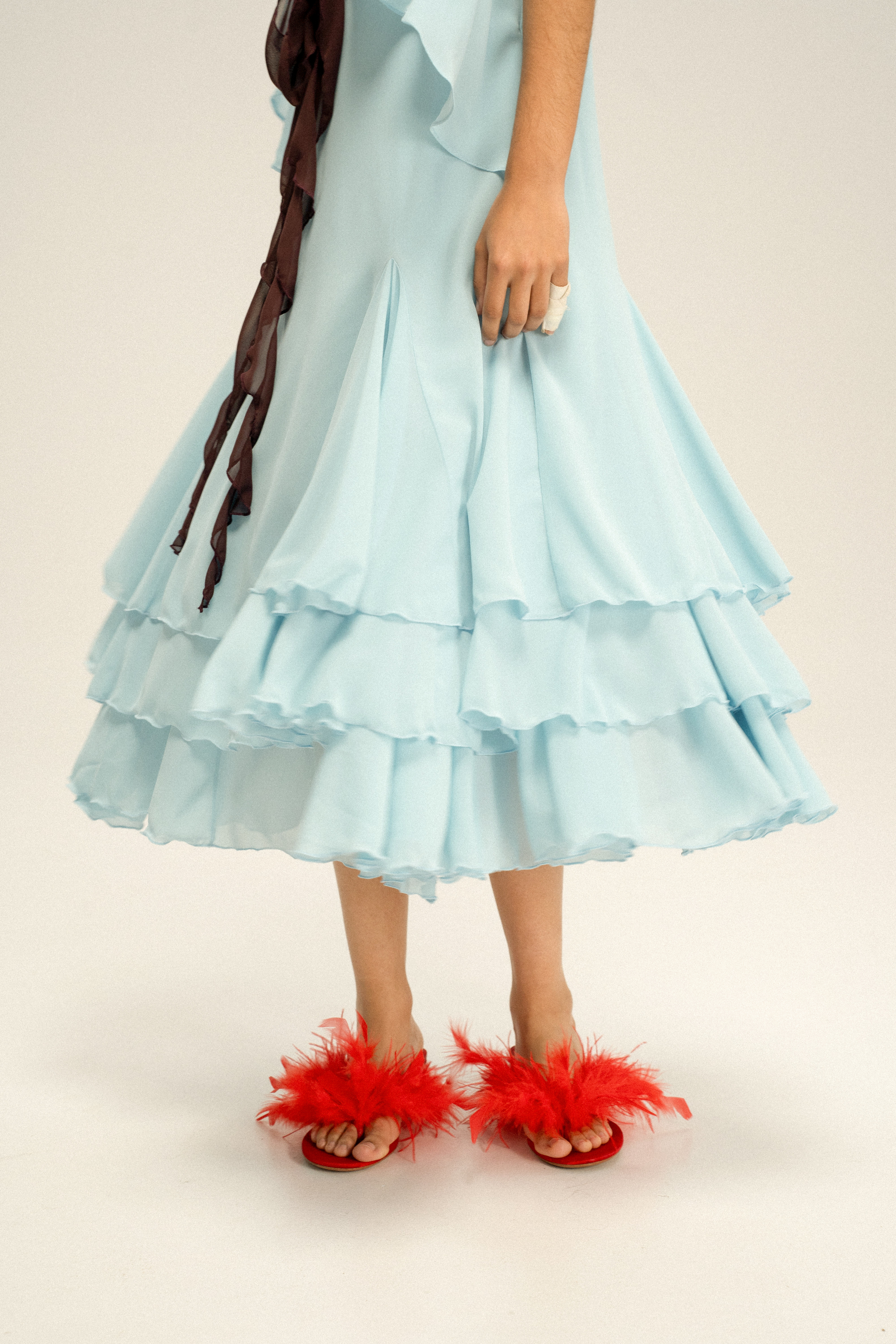 - Платье из нескольких слоев ткани дополненное клиньями по подолу с густыми многослойными воланами.