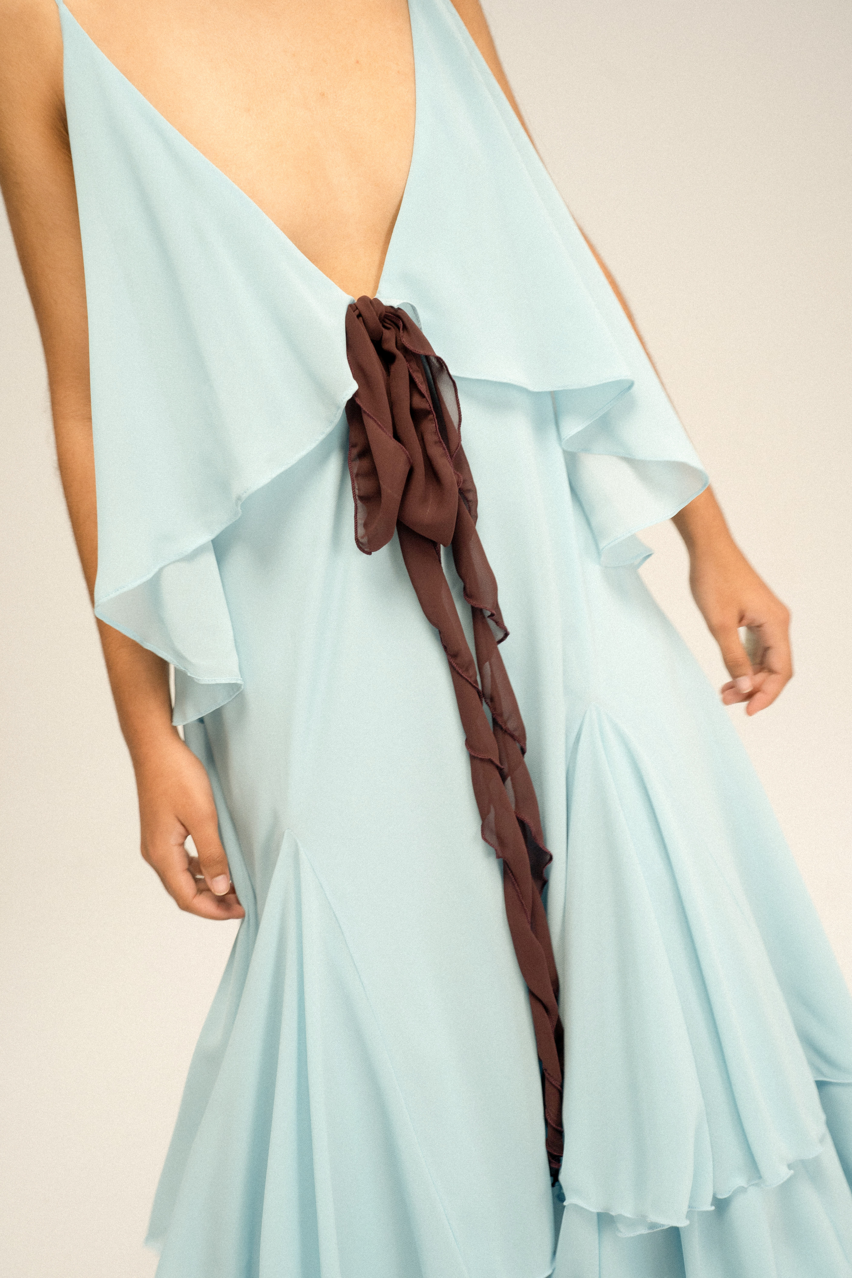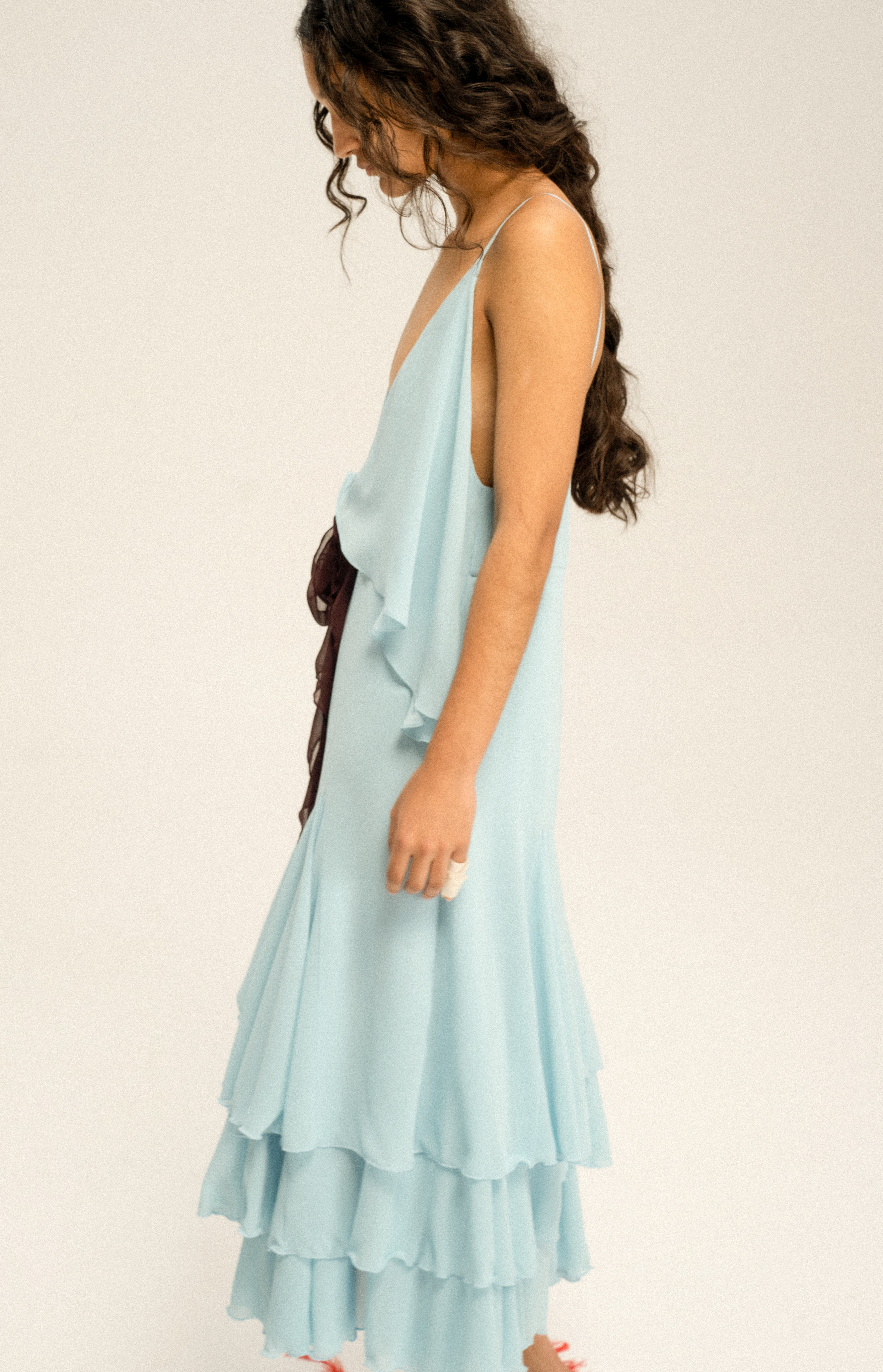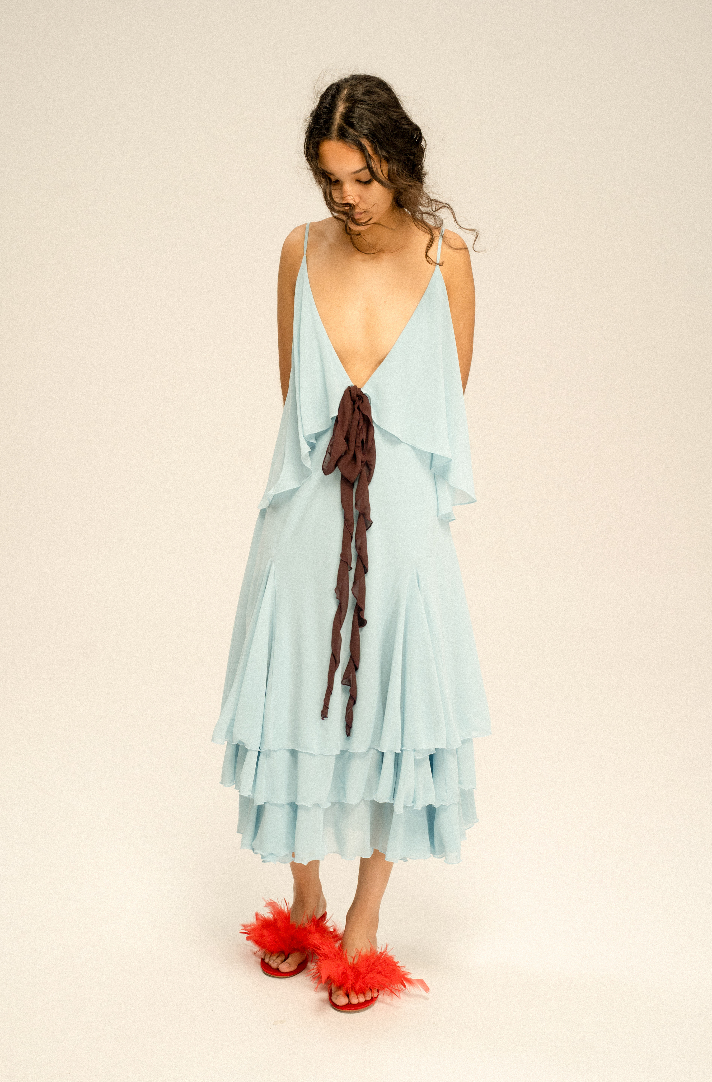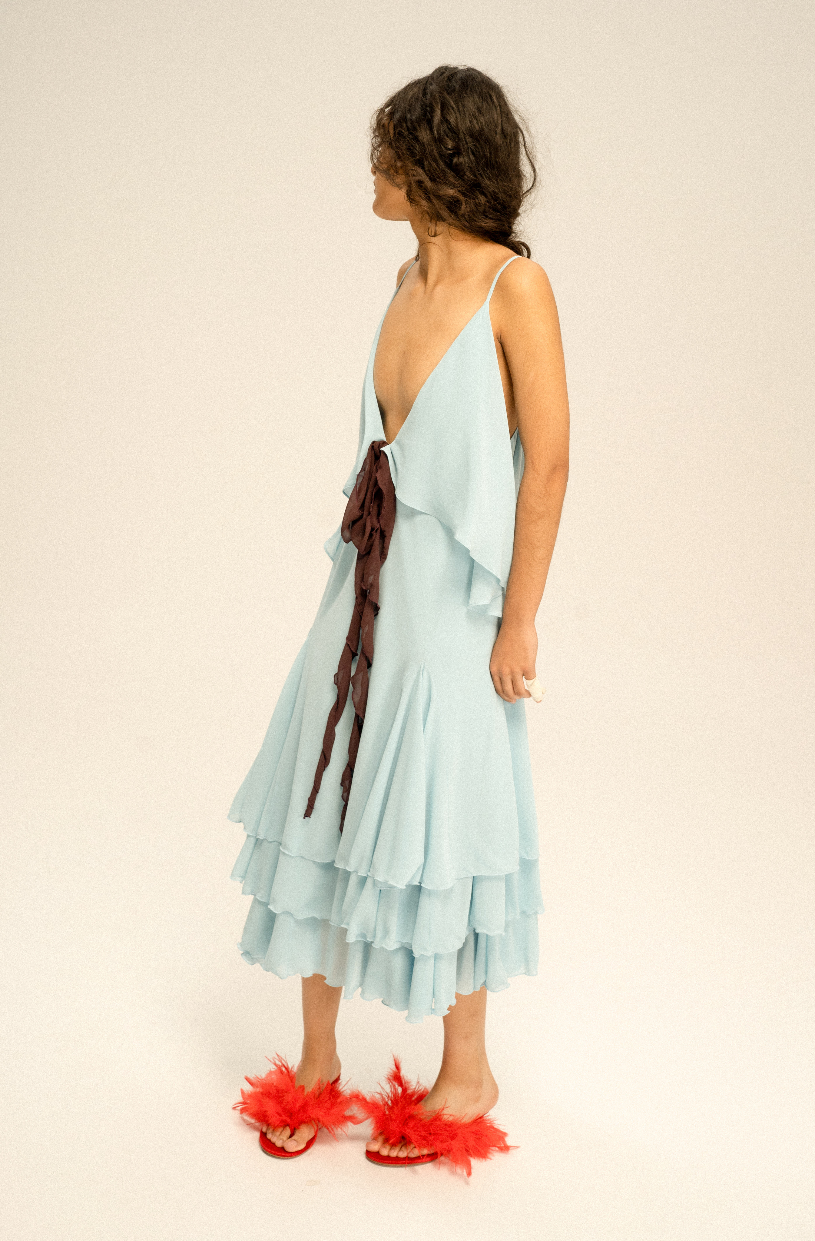 - Платье из нескольких слоев ткани дополненное клиньями по подолу с густыми многослойными воланами.
