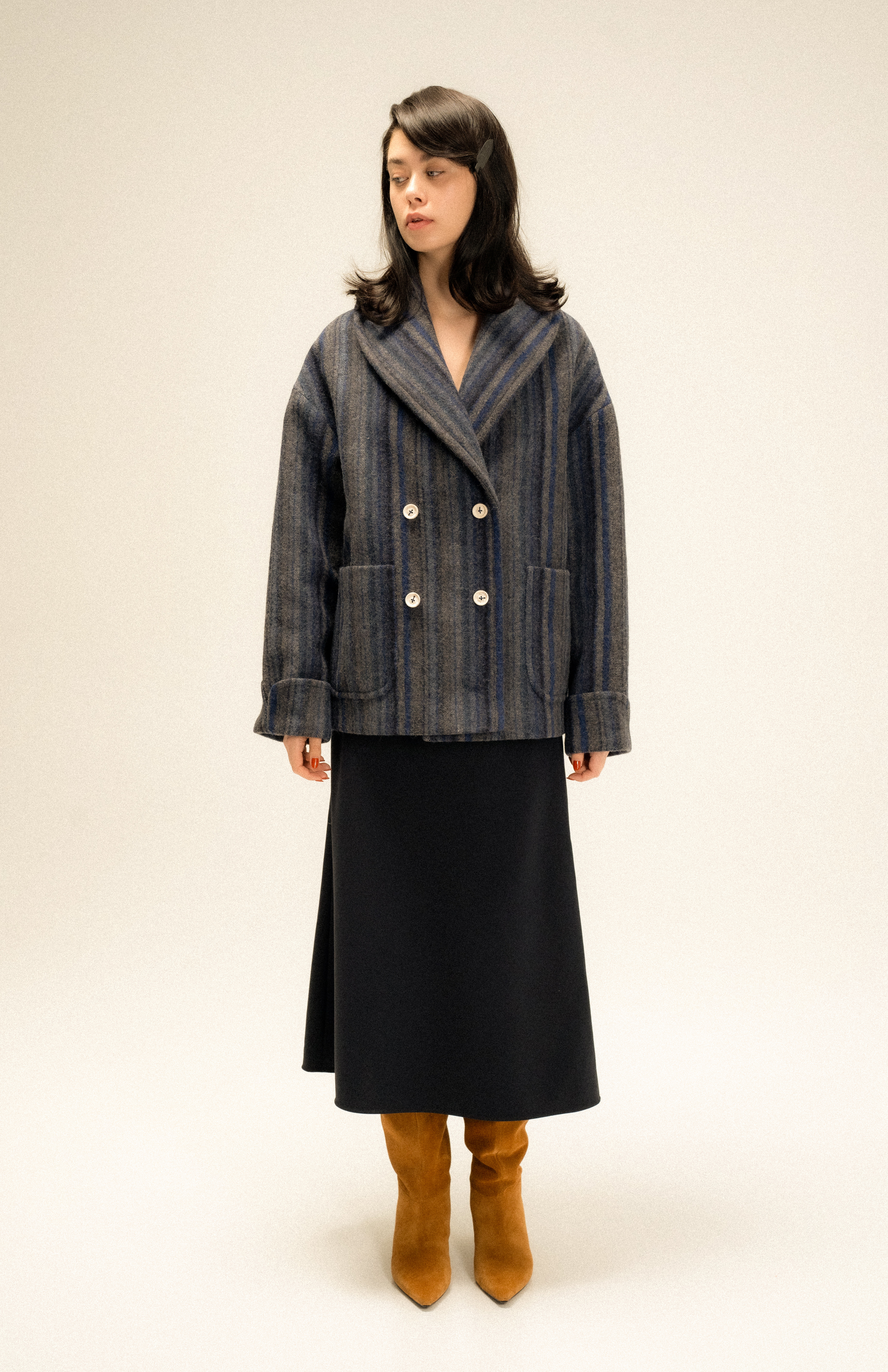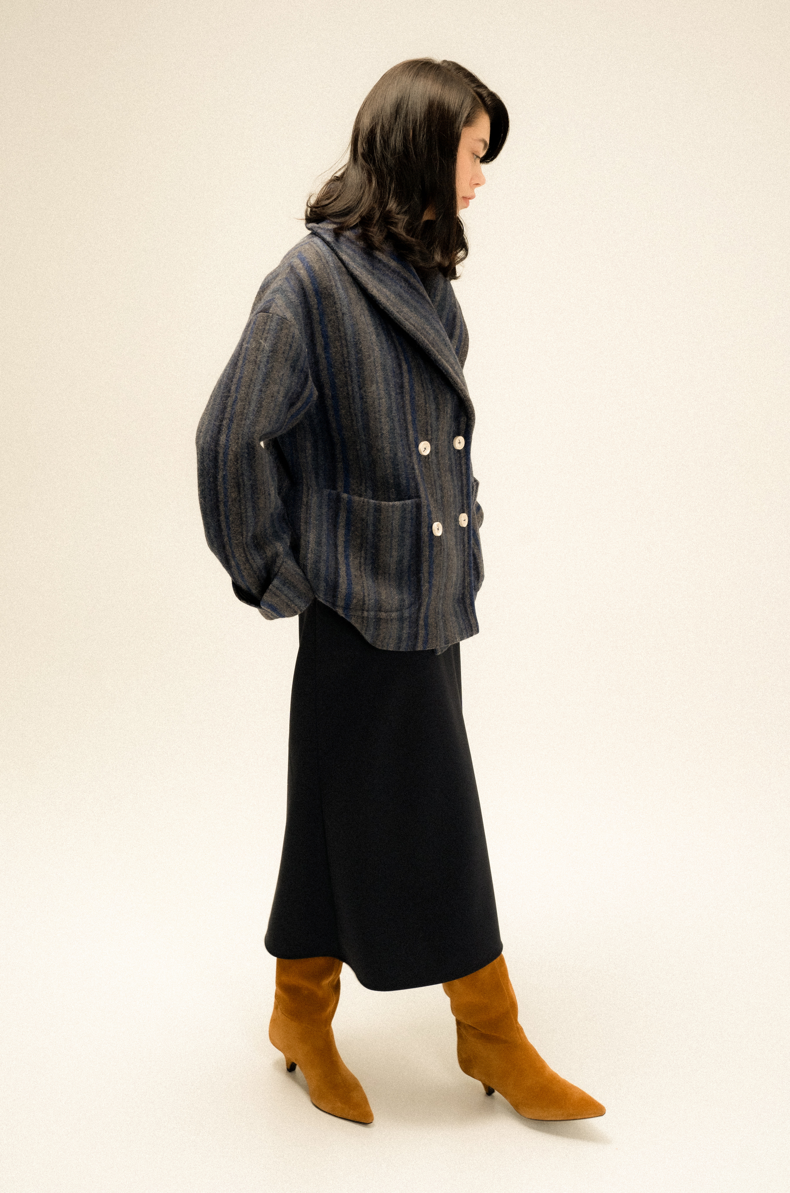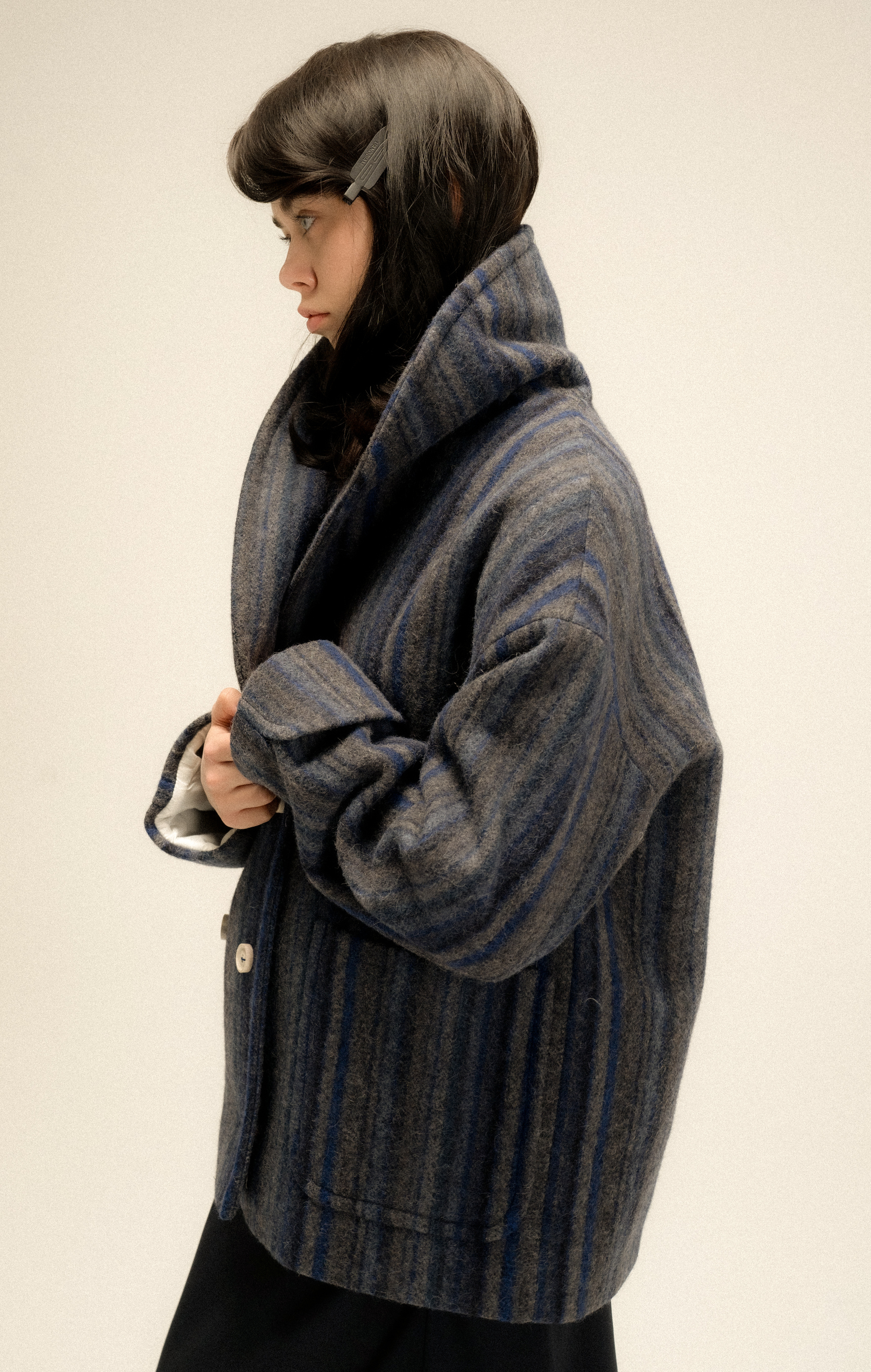 - Пальто из плотной альпаки с шерстью с широким воротником шааль и фигурными манжетами.
