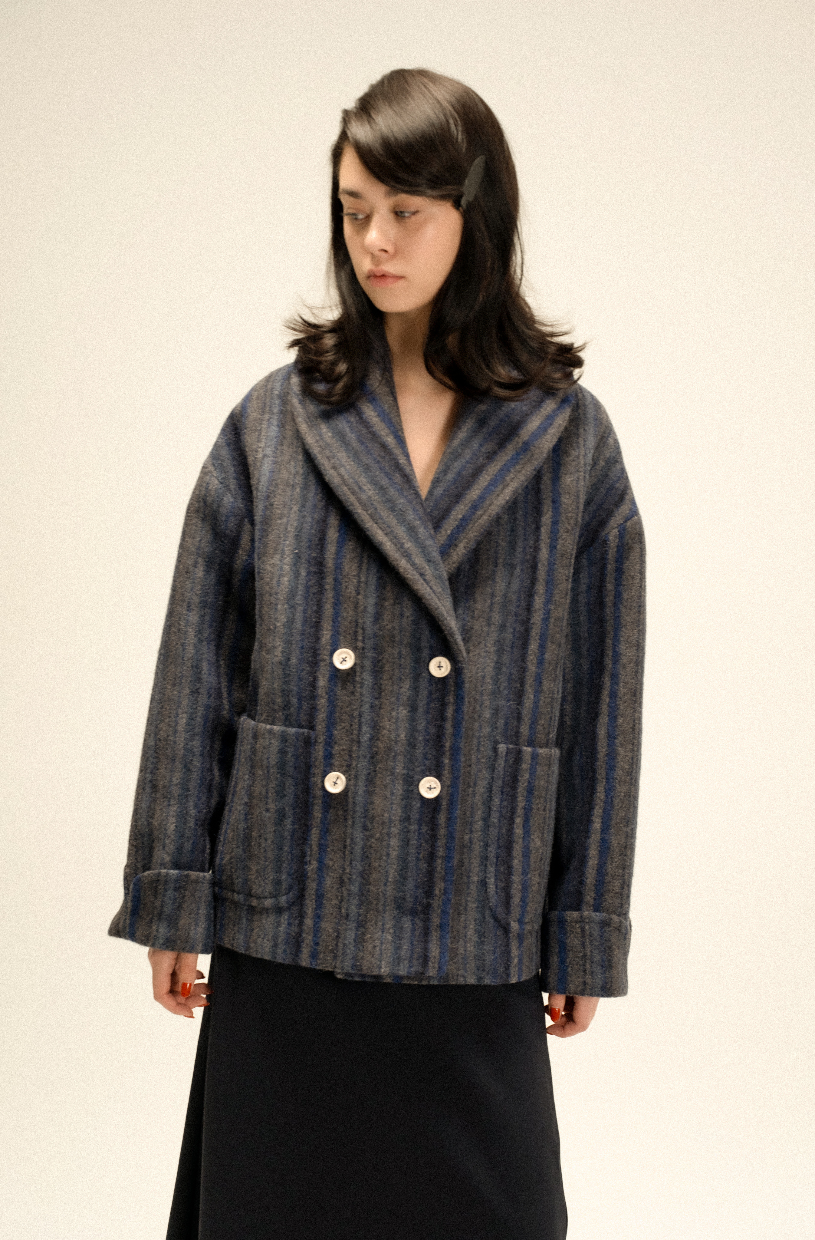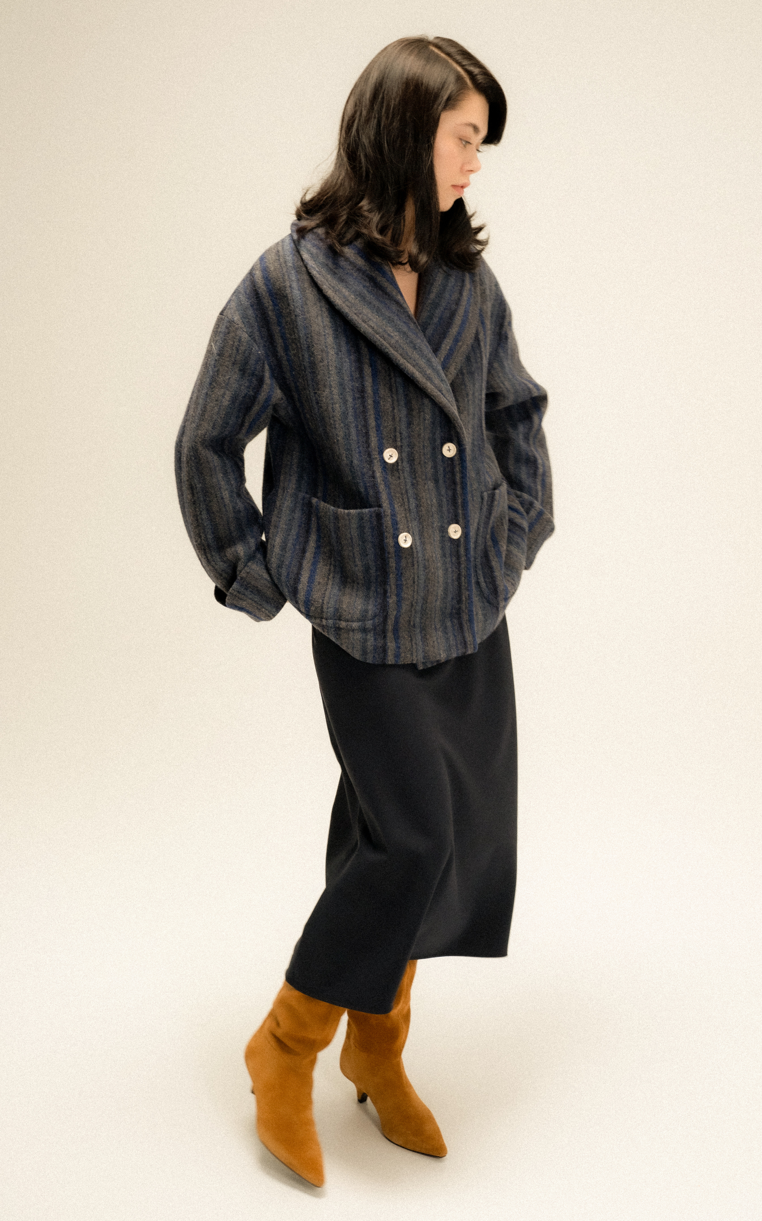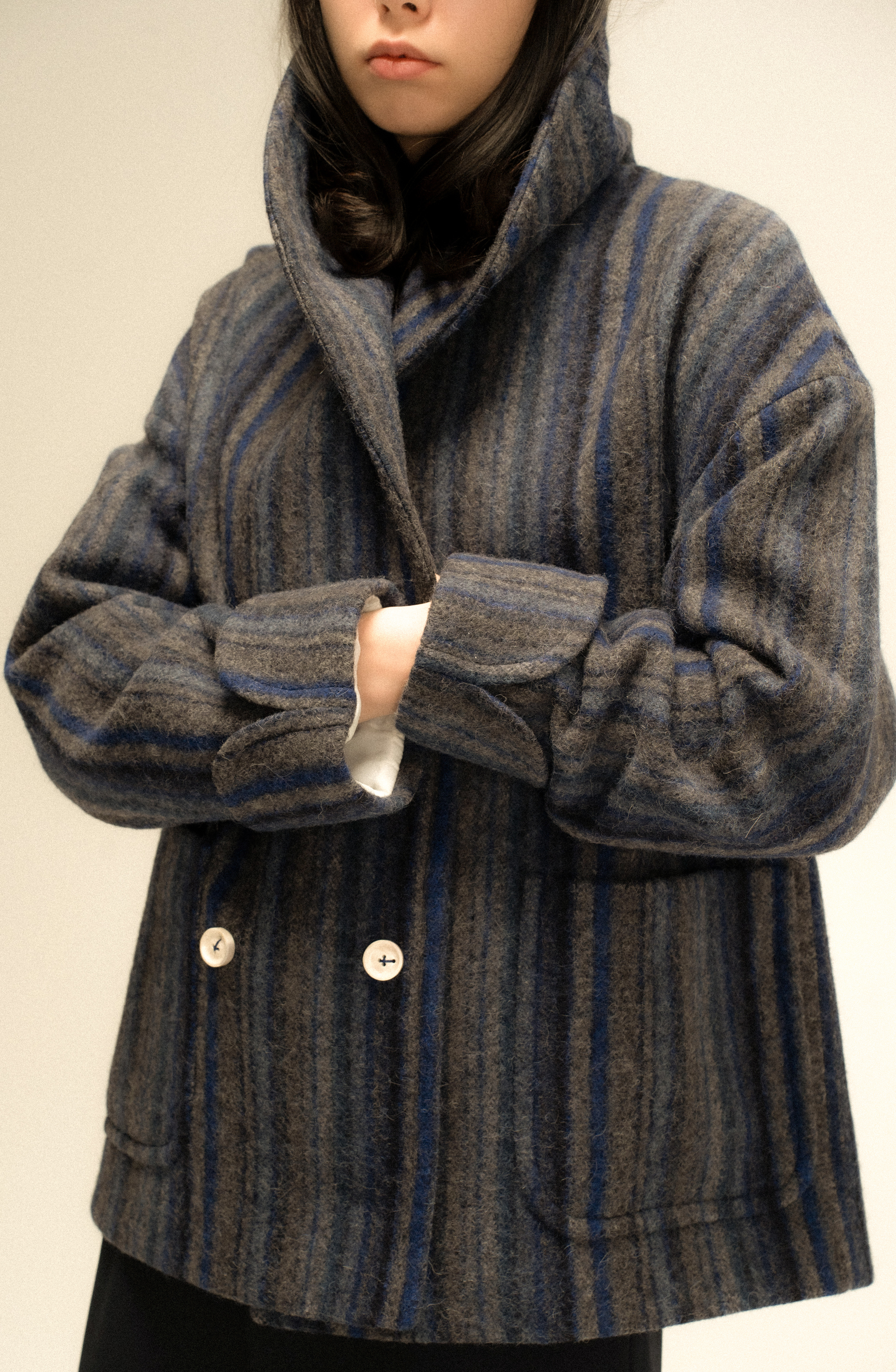 - Пальто из плотной альпаки с шерстью с широким воротником шааль и фигурными манжетами.